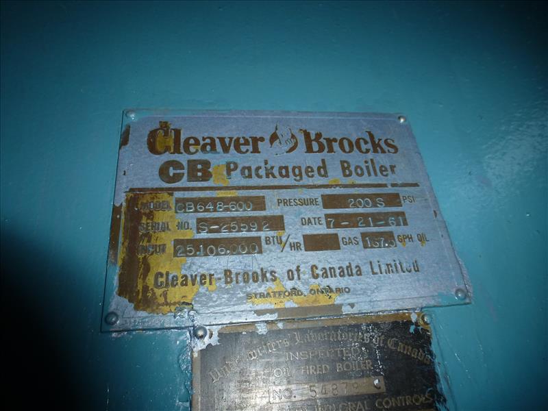 Cleaver Brooks natural gas-fired steam boiler, mod. CB-266-300, ser. no. S-51434, 200 psi. c/w Fireye flame monitor. ITEM TO BE DISCONNECTED AT STACK. STACK TO REMAIN IN CEILING.
