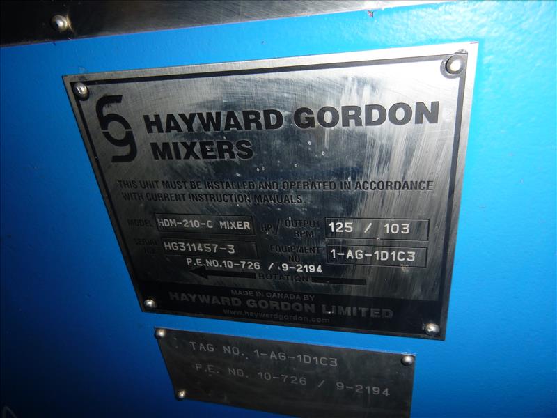 Hayward Gordon Agitator Drive Unit c/w Hayward Gordon, mod. HDM-210-C, ser. no. HG311457-3 Gear Reducer, 125 hp / 1800 RPM motor, Flowserve Double BPO seal & agitator