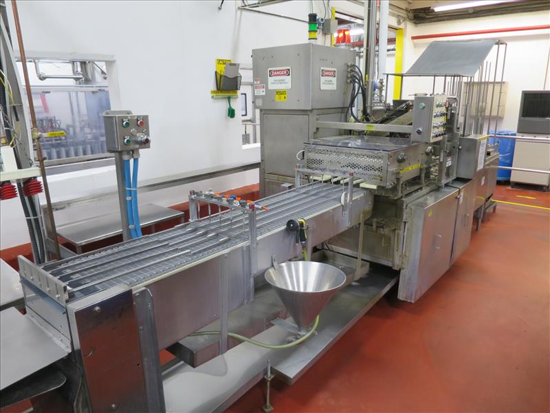 Autoprod Inc. "Portion Pack" single-serving cup filling and sealing machine, model FP-2X4, ser. no. AP-1402, 3, 4, and 6 ounce plastic cup sizes w/ foil lids, (8) filling stations, c/w 4-lane outfeed belt conveyor, and 12-up vacuum case packer