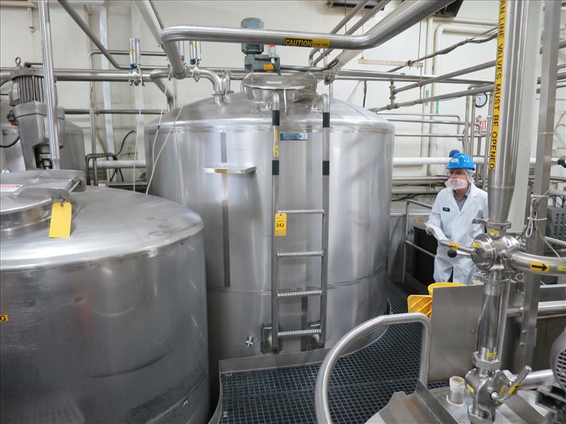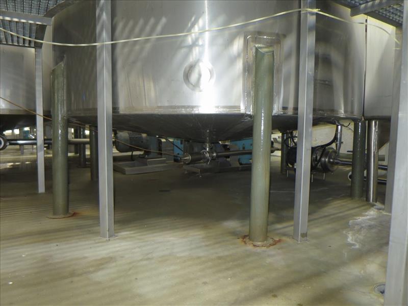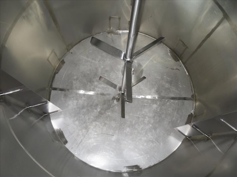 approx. 3,603 gallon S/S closed-top vertical mix/blend tank, c/w: dished top & bottom, bottom outlet, center top-mounted 2-level agitator, top manway, (2) baffles, (2) spray balls, sample port, 4-step ladder, (Tank #2)