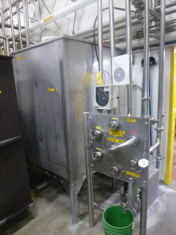 Can Line rectangular CIP Tank, with (1) APV Puma 15 h.p. centrifugal pump, (1) centrifugal pump (I.D. N/A), & flow panel, etc.