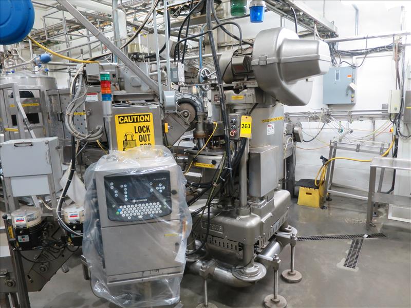 Elmar (remanufactured) 28-station S/S rotary composite can filler, 275, 283, and 330 milliliter can sizes, model RPE-528I-LH, ser. no. XM97-2314 c/w Lightnin agitator, level control, spray ball, vacuum de-foamer, and guarding 1/ Angelus 6-station composite can seamer, model 60L, ser. no. 12661595, c/w can infeed and outfeed conveyors, & Lincoln auto. greasing system, approx. 500 cans per minute (Tagged 261), and Fleetwood Systems S/S rotary can lid feeder, c/w S/S lid infeed conveyor to seamer, ser. no. 25964, approx. +/- 40 lid magazines (Tagged 262), and Can Line Parts (Tagged 263)