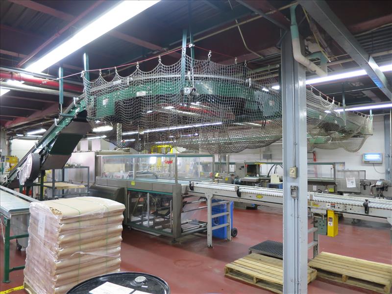 overhead powered belt and roller full tray conveyor system to palletizer, including: approx. 16" x 30' belt conveyor c/w incline section, and approx. 16" x 100' powered roller conveyor c/w brake system