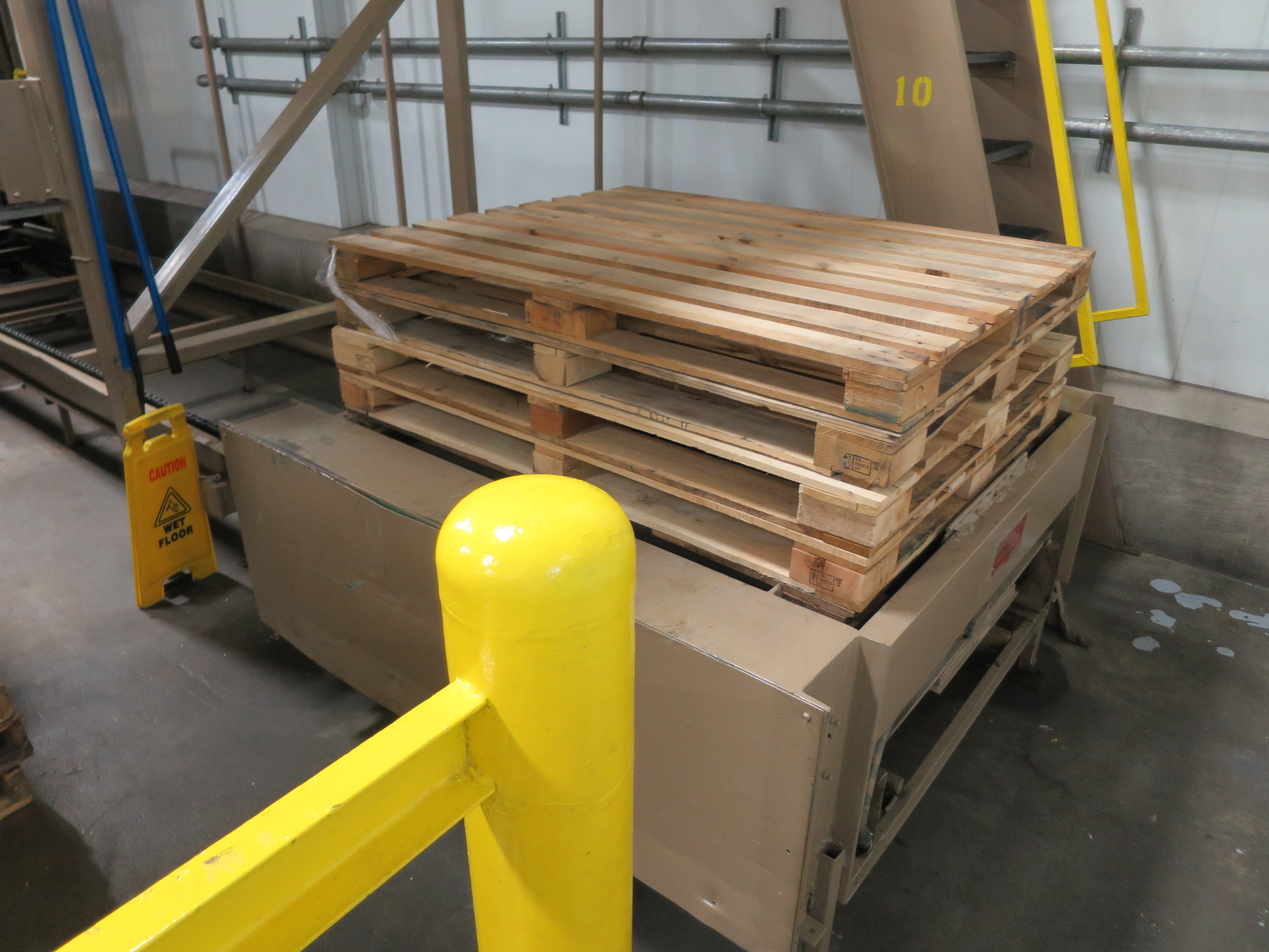 Acme Handling Systems empty can depalletizer, model 200-2D, ser. no. 1580-578-231, c/w can feed belt conveyor, & empty pallet stacker, model 4456-EPS, ser. no. 1580-578-195