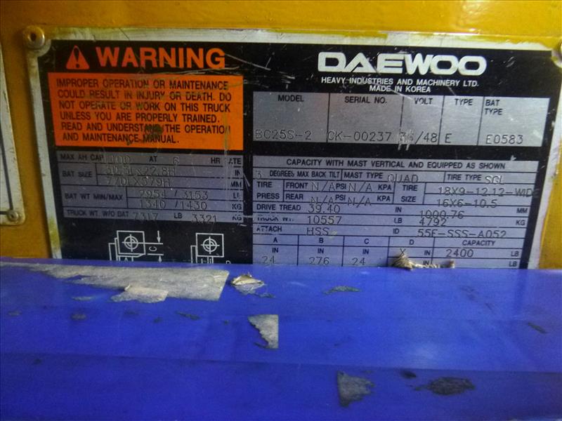 Daewoo Electric Forklift, model BC25S-2, 2400 lb capacity @ 24" load centers to 276" lift height, 48 volt, quad mast, side-shifter, s/n CK-00237