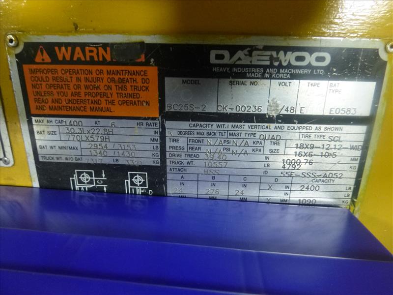 Daewoo Electric Forklift, model BC25S-2, 2400 lb capacity @ 24" load centers to 276" lift height, 48 volt, quad mast, side-shifter, ser. no. CK-00236