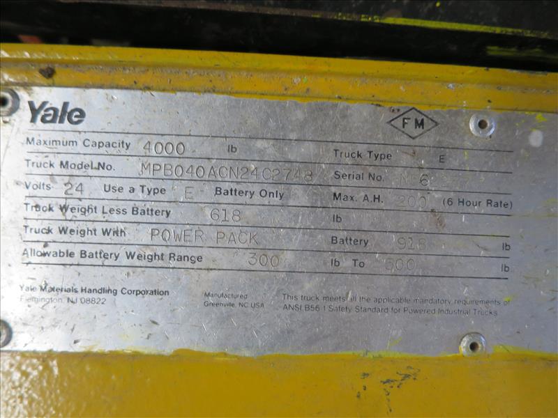 Yale electric Pallet Mover, model MPB040ACN24C2748, 24 volt, s/n N562237, 4,000 lb. cap.