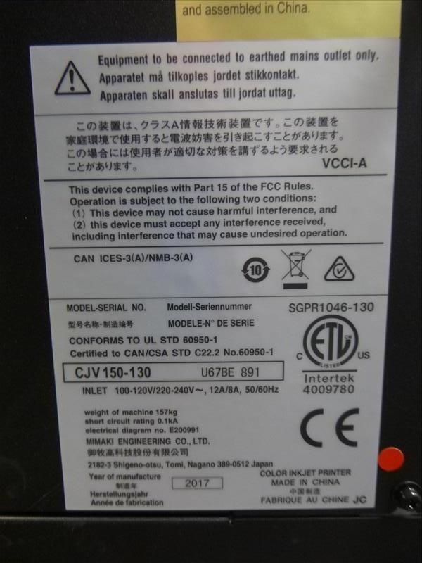 Mamaki large format solvent inkjet printer/cutter, mod. CJV150-130, ser. no. U67BE891 (mfg. yr. 2017), 1371 mm max. width, 1 mm max. thickness, 1440 dpi max resolution