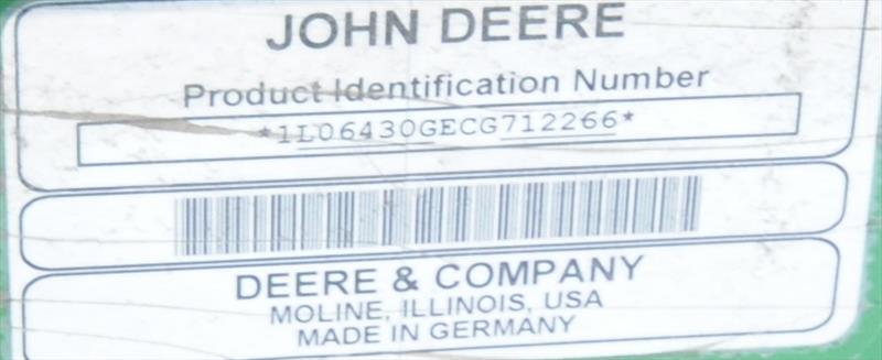 JOHN DEERE (2012) 6430 TRACTOR WITH JD 4.5L ENGINE, 4WD, JOHN DEERE H340 HYDRAULIC LOADER ATTACHMENT, BUCKET AND FORK ATTACHMENT, APPROX. 2,425 HRS RECORDED ON METER AT THE TIME OF LISTING, UNIT # 1074, S/N 1L06430GECG712266 (BARRIE P.Y)
