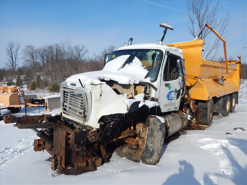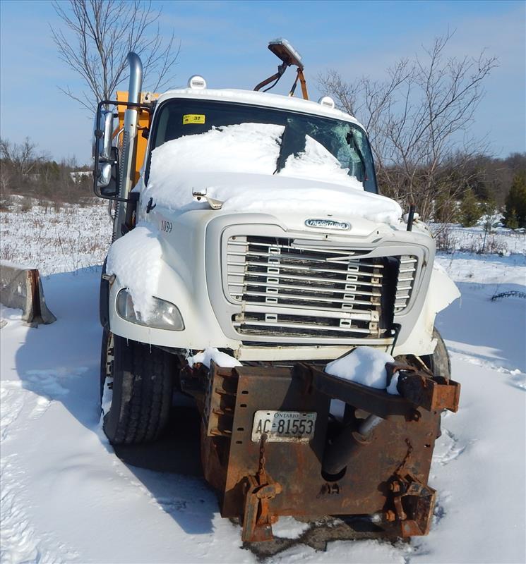 FREIGHTLINER (2012) M2 112V TRI AXLE PLOW TRUCK WITH 12.8L DETROIT DIESEL DD13 TURBO DIESEL ENGINE, EATON FULLER 8 SPEED MANUAL TRANSMISSION, 22,000LBS FRONT AXLE, 20,000 LBS THIRD AXLE, 23,000 LBS REARS, VIKING-CIVES PROLINE II PL2021LW-II LIVE BOTTOM BOX, (2) 155 GAL POLY LIQUID TANKS, STANDARD VIKING PLOW AND SIDE WING MOUNTS WITH HARNESS AND REXROTH DIGITAL CONTROLS, UNIT # 1039 , VIN 1FVMC7DV9CHBU1041 (ACCIDENT DAMAGE) (COOKSTOWN P.Y)