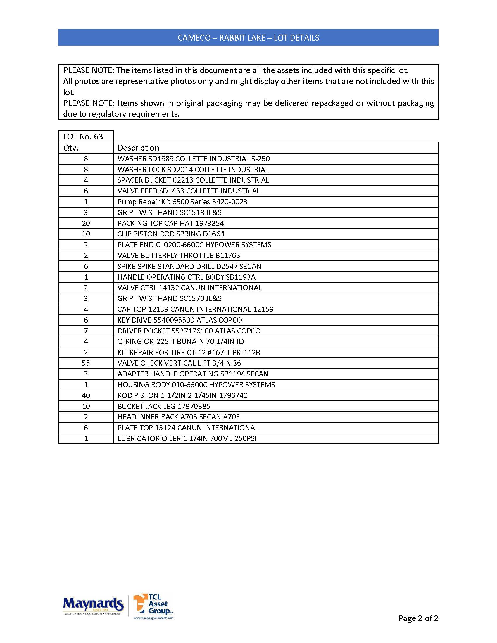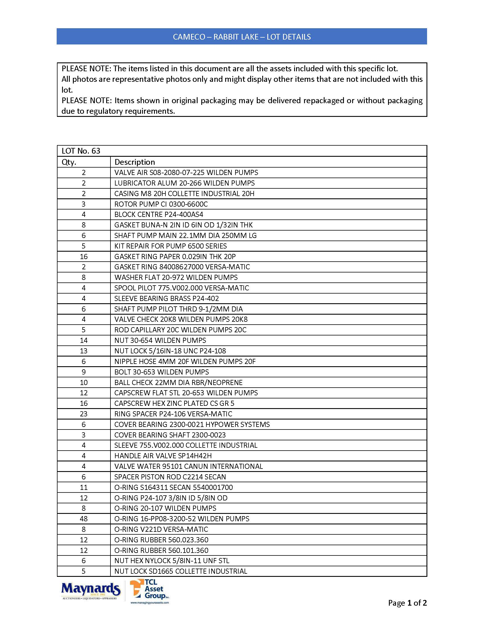 misc. pump spare parts, etc. (please see attached for inclusive listing)