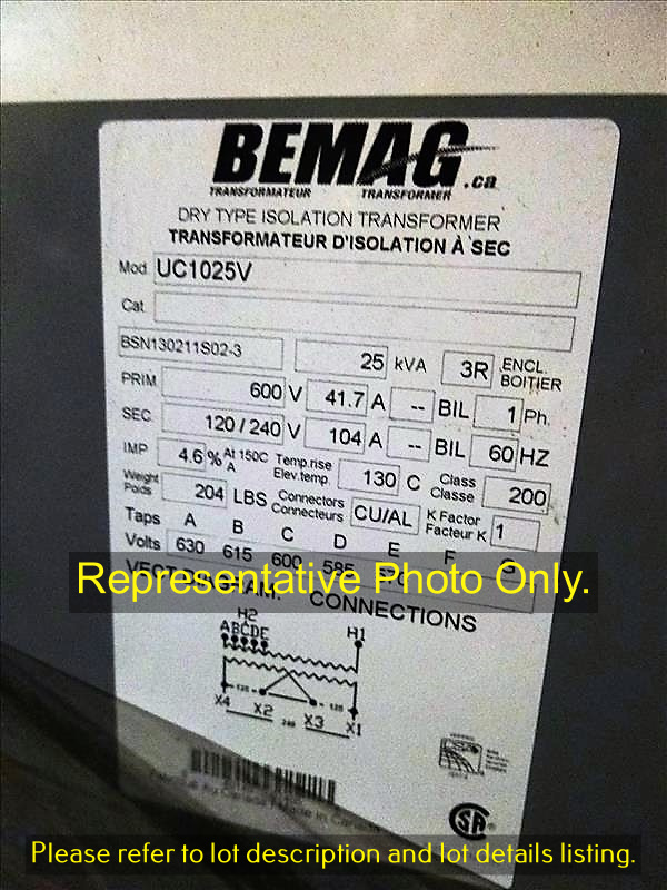 Bemag dry-type isolation transformer, 25KVA, 600V primary