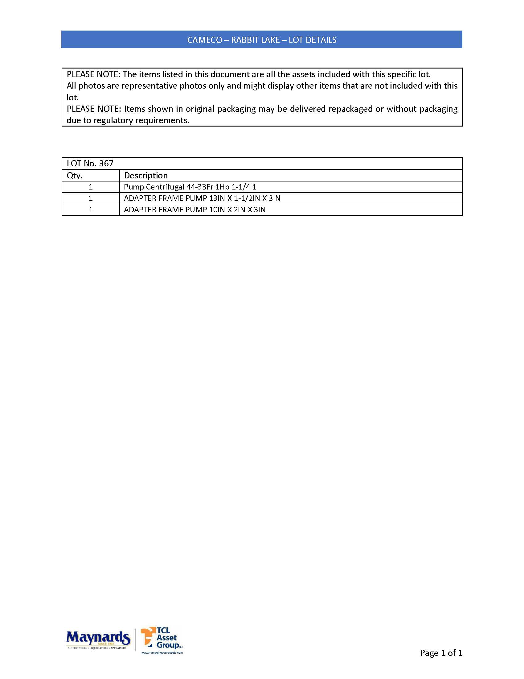 misc. pump parts incl.: (1) centrifugal pump, 44-33Fr 1Hp 1-1/4 1: (2) frame adapters, 13\" X 1-1/2\" X 3\" and 10\" X 2\" X 3\"