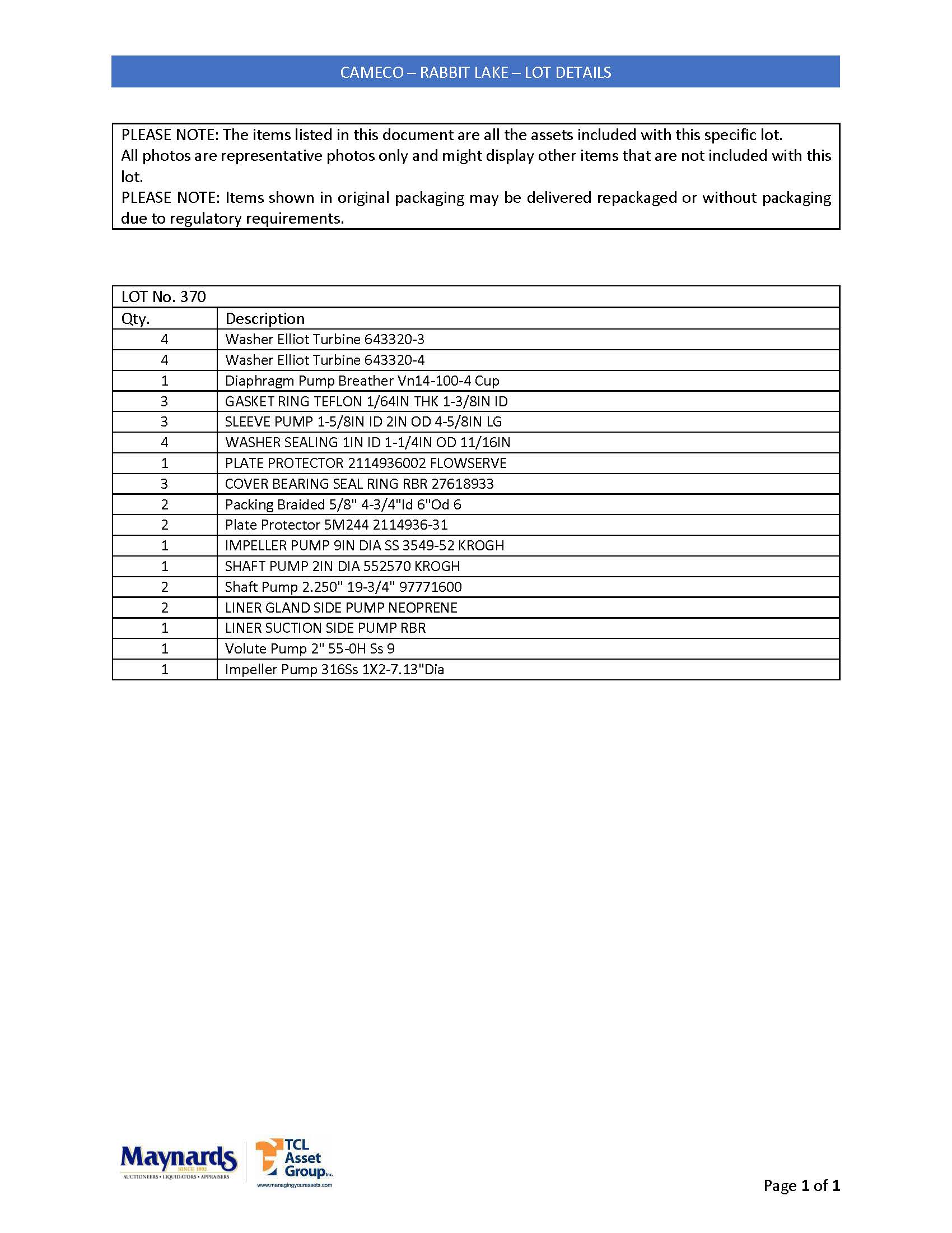 misc. pump parts, etc. (please see attached for inclusive listing)