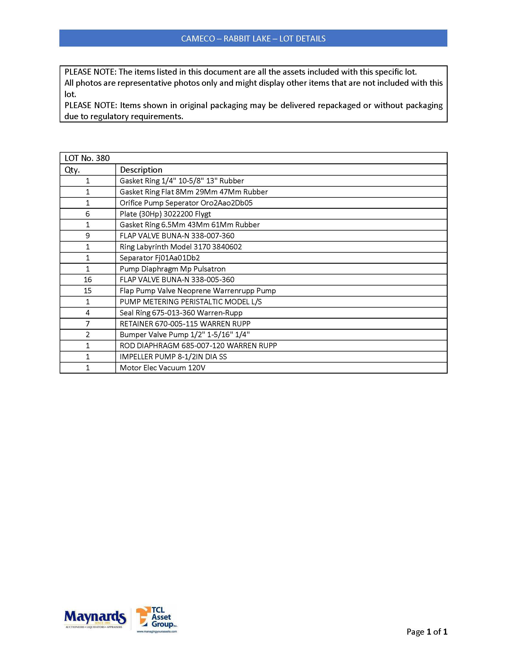 misc. pump parts, etc. (please see attached for inclusive listing)