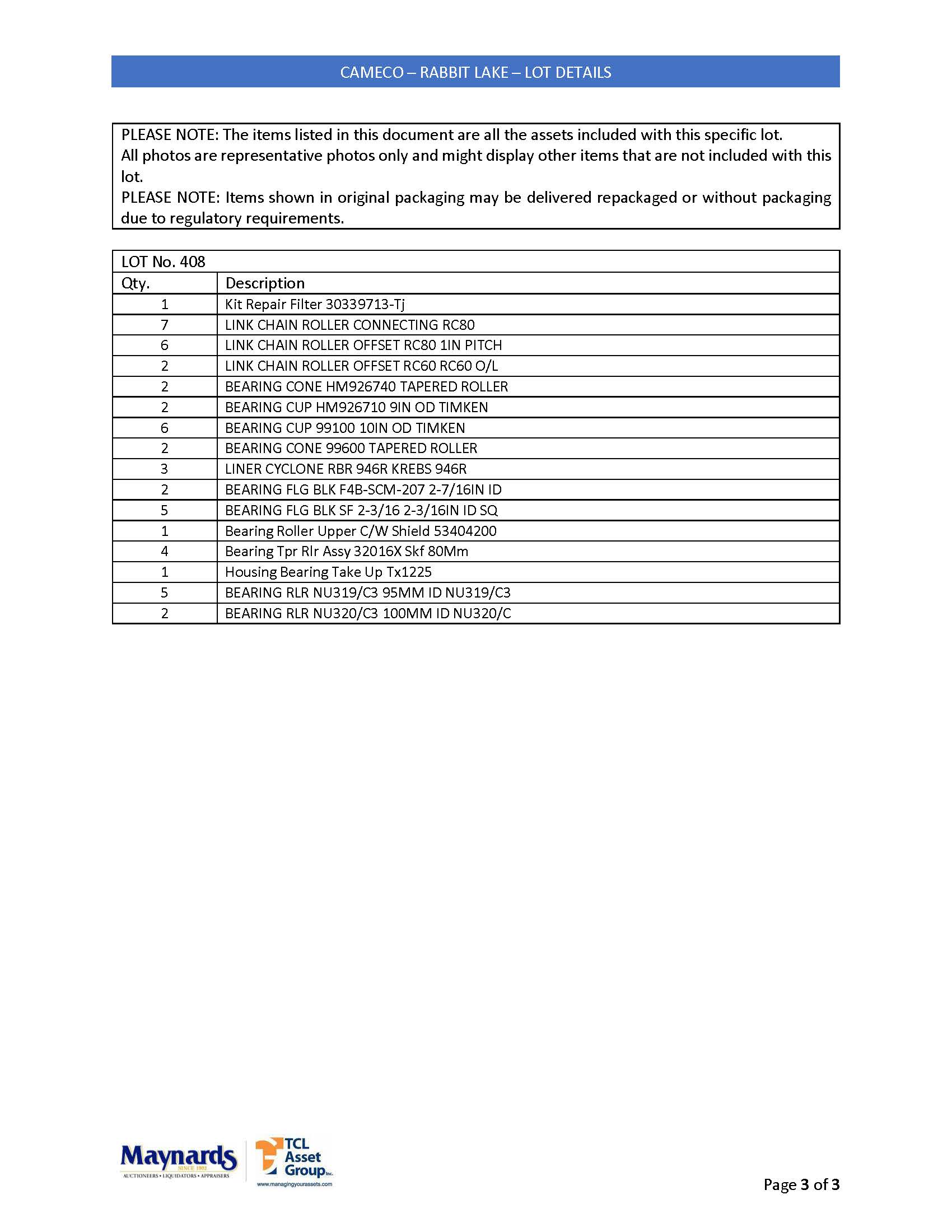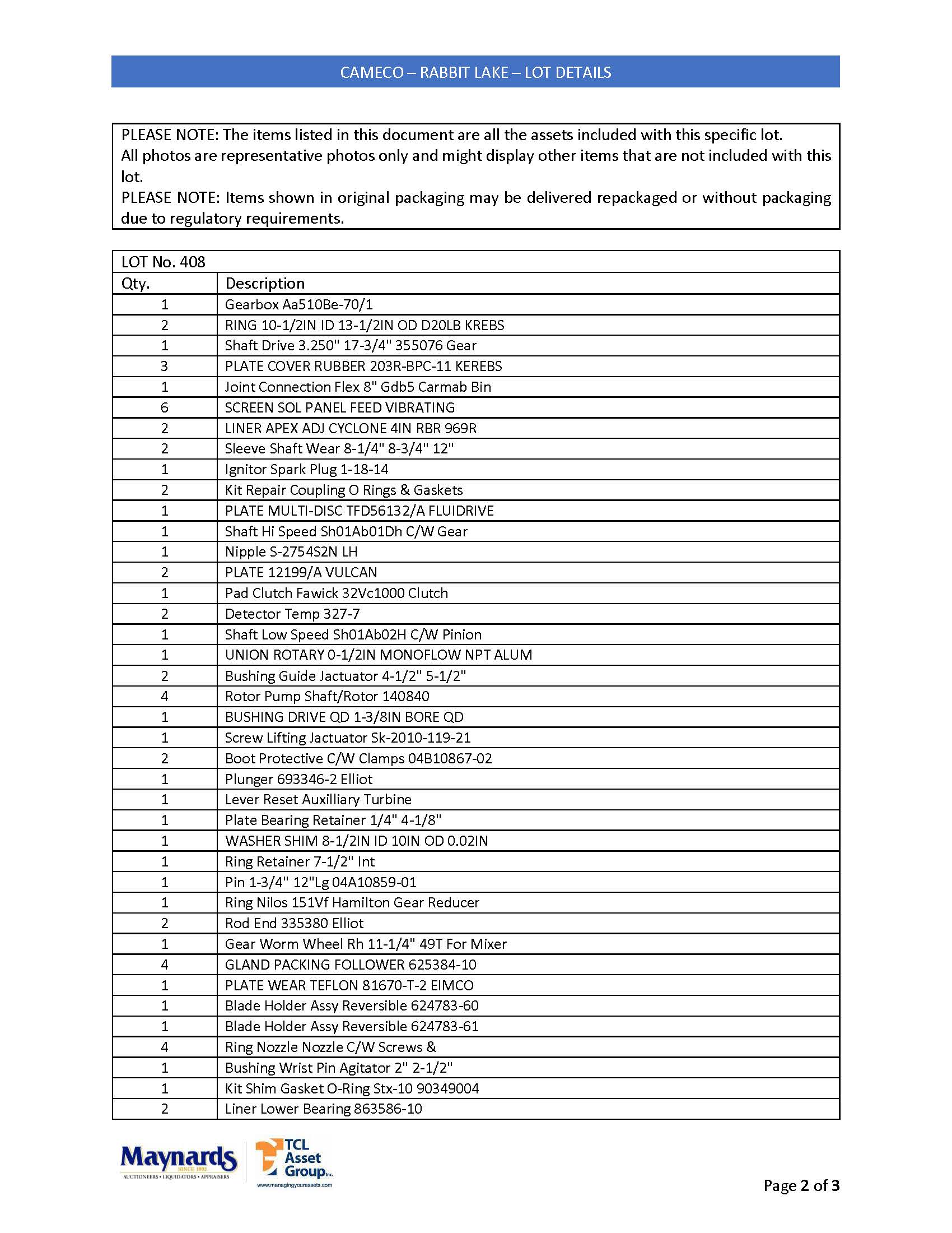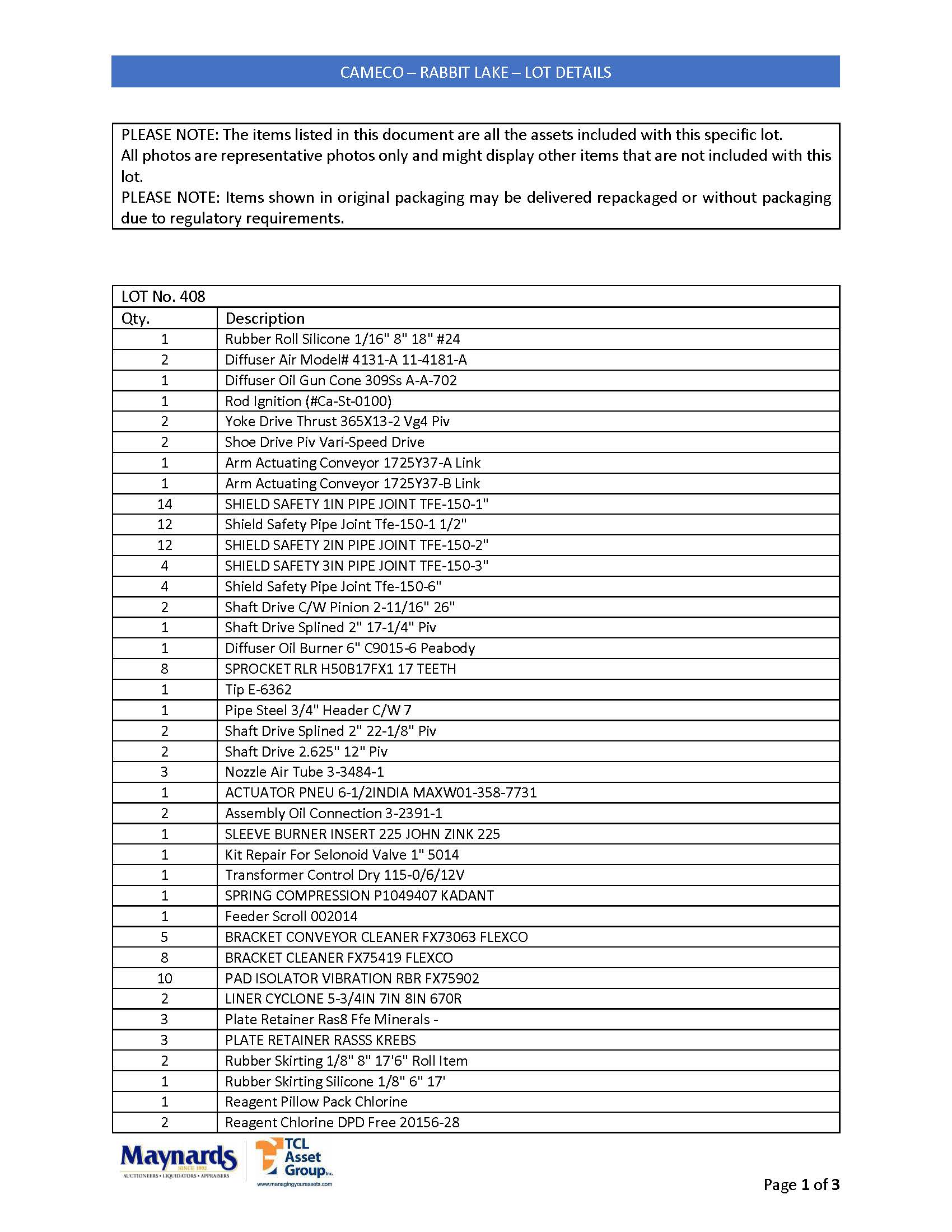 misc. processing equipment equipment spare parts, etc. (please see attached for inclusive listing)