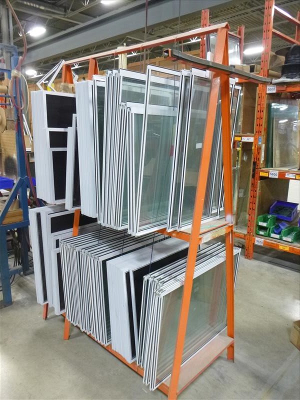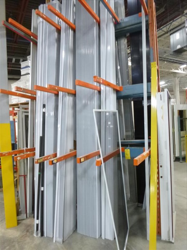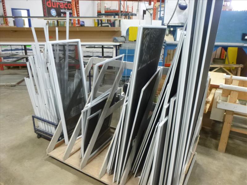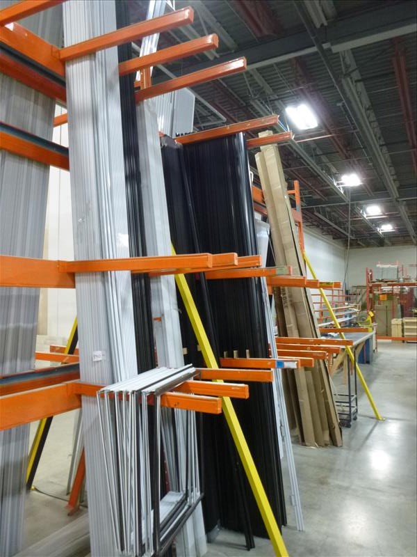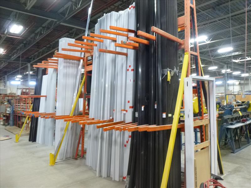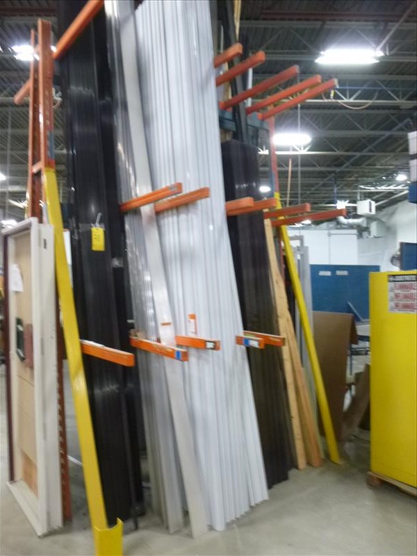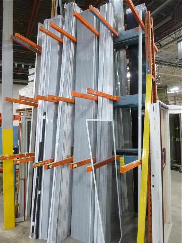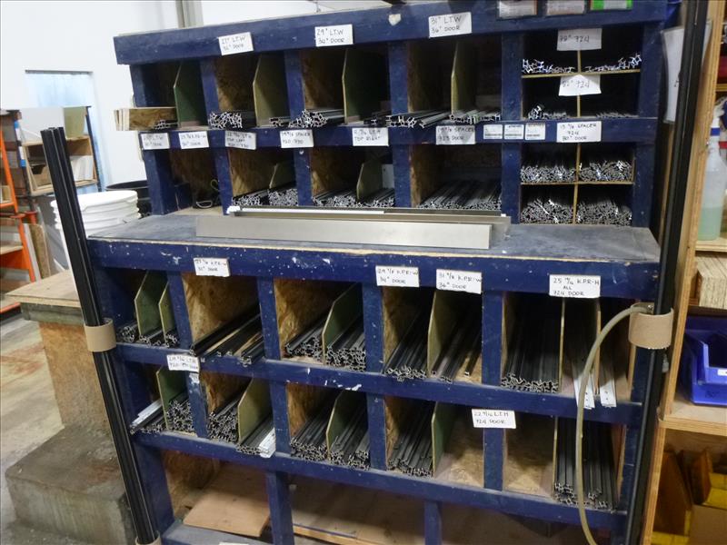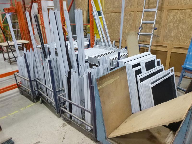 (lot) aluminum stock; new, WIP, finished, scrap c/w (3) upright storage racks [Winner will be determined based on sum of bids on lots 47 to 76 vs bid on bulk lot 46] (subject to confirmation)