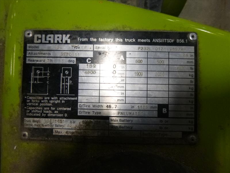 Clark propane forklift truck, mod. C25L, ser. no. P232L-0121-9897M9, 5000 lb. cap., 3-stage mast, side-shift, pneumatic tires, 525 hrs. (ca. 2014) (delayed removal time applies)
