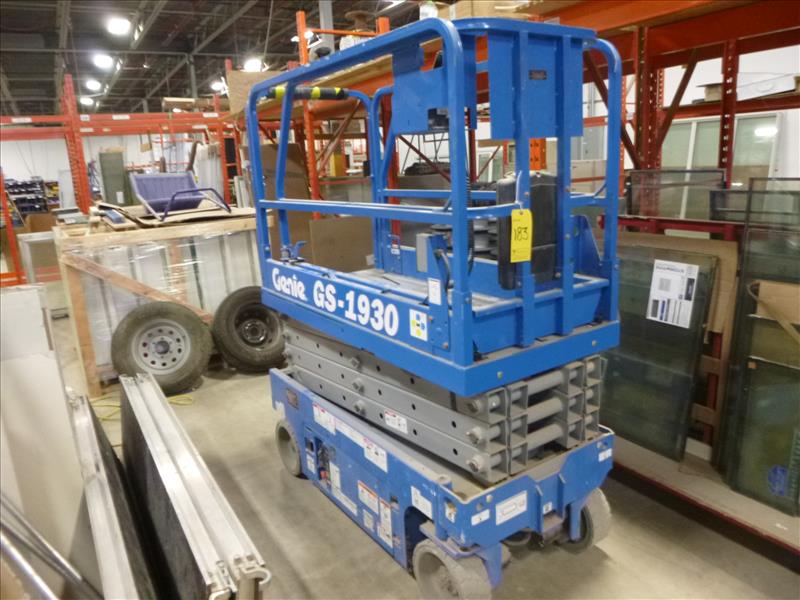 Genie scissor lift aerial work platform, mod. GS-1930, 500 lbs. cap., 19 ft max. lift, extendable deck, electric, 74 hrs.