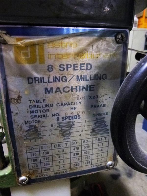 Astro Intl 8-speed drilling/milling machine, mod. MD-16, ser. no. 892075 c/w 4 in machine vice
