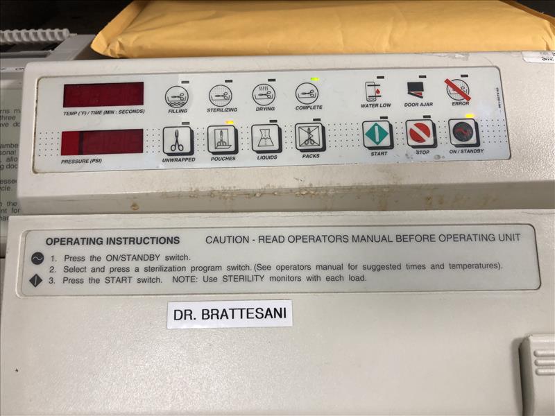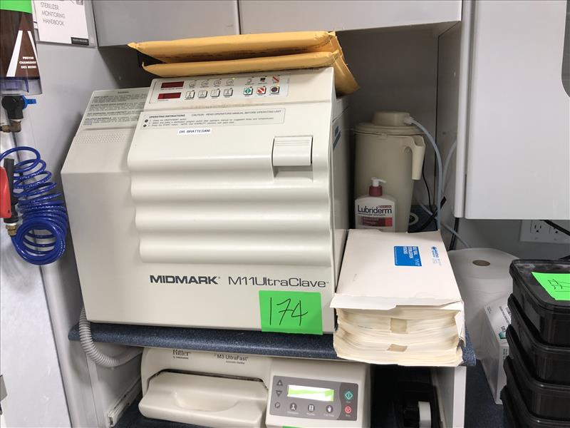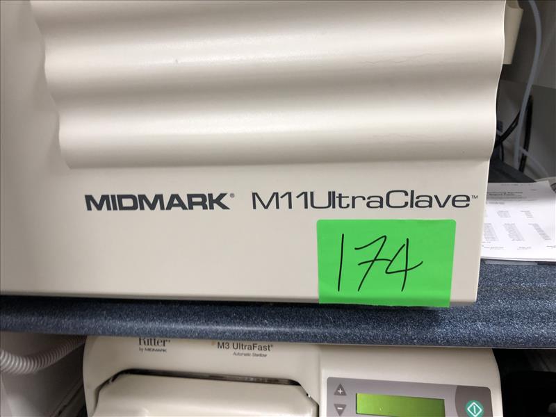 Midmark model M11 UltraClave sterilizer, sn ETO15938, preprogrammed cycle programmable controls, auto open door drying, Steam-flush pressure-pulse air-removal system, LCD display alerts, reservoir fill port and drain tube, sterilization chamber dim approx 11in diameter x 18in depth x 6.5 gal volume, fits (2) 9 in w x 15 in l, (2) 6.6 in w x 15 in l trays, plus (2) extra chamber gaskets, (1) pack of sterile pouch