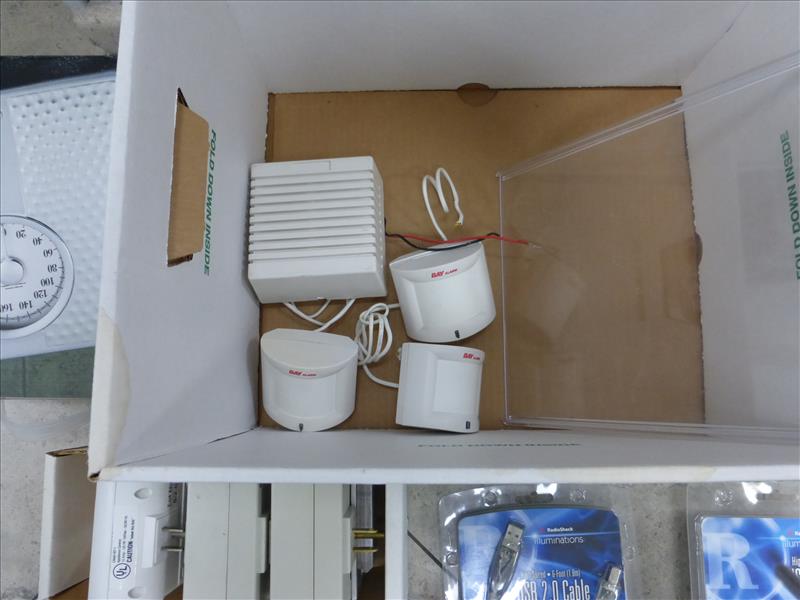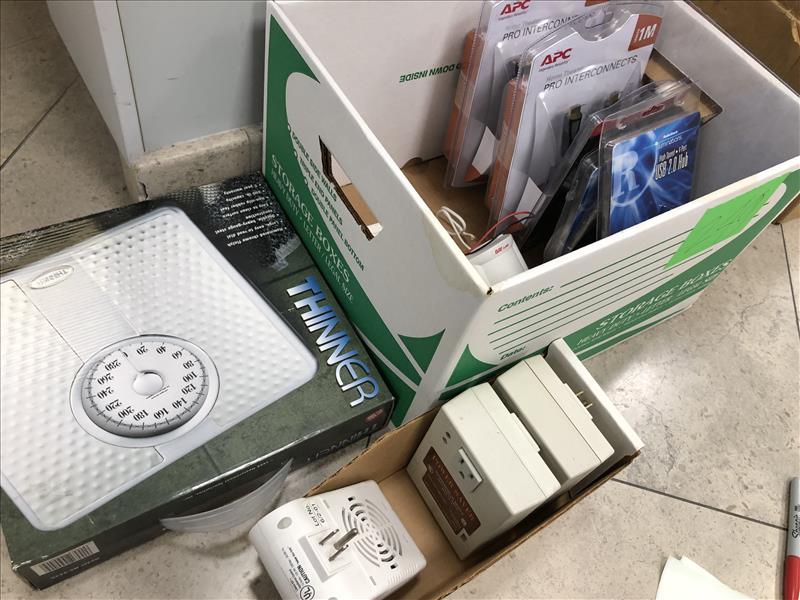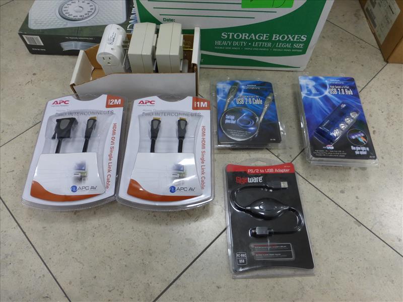 Assorted equipment including (1) Thinner analog bathroom scale, (1) multi outlets power receptacles, PS/2 to USB adapter, HDMI to HDMI single link cables, USB 2.0 hub/cables