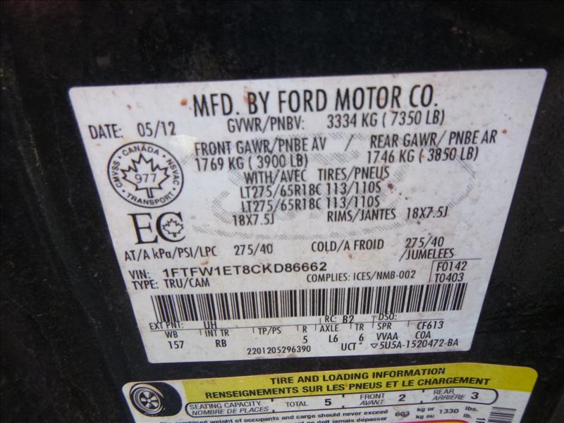 Ford pick-up truck, mod. F150, VIN 1FTFW1ET8CKD86662 (2012), unit no. 50-01, 197000 Km, 1.5 L EcoBoost V6 eng., 4-door, 4x4, hitch (located at 166 Rue Maltais)