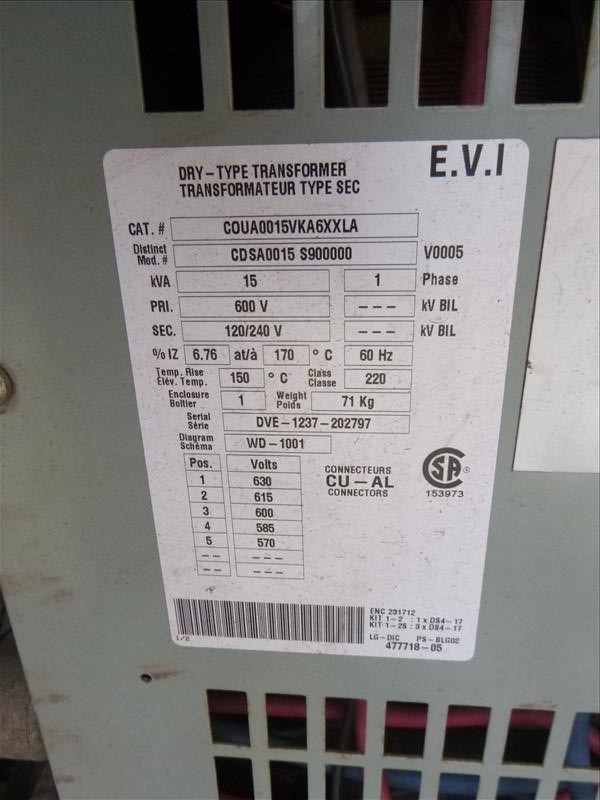 EVI 15 KVA transformer c/w enclosure, skid mounted (located at 166 Rue Maltais)