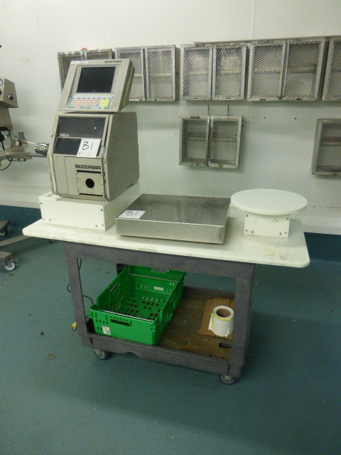 Bizerba check-weigher system w/ Bizerba GS label printer ser. no. 1945663 and Bizerba AB controller, ser. no.s 1945663 c/w s/s platform, 20 in. x 16 in. and cart