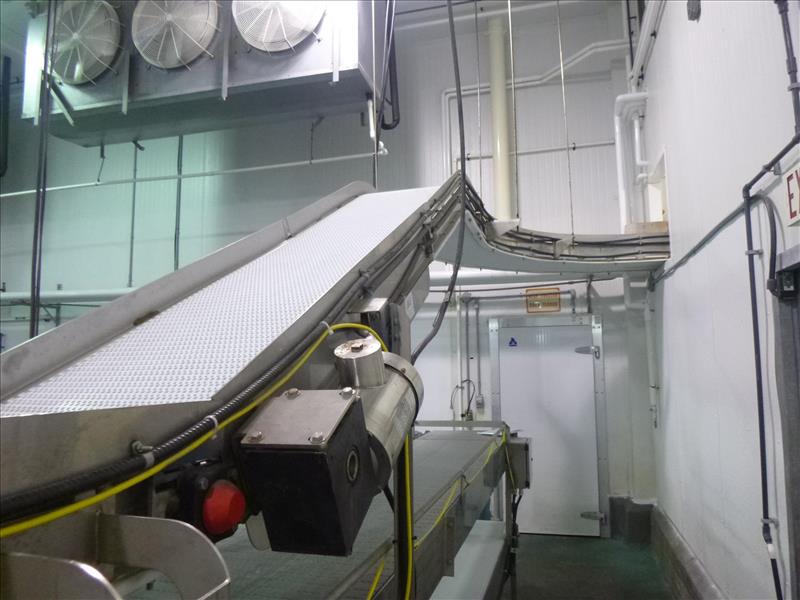 conveyor, suspended, s/s, powered, fluted interlox belt, approximately 20 in. x 19 ft. inclined + 90 deg. + 28 ft. + 90 deg. + 10 ft. inclined (empty case conveyor)