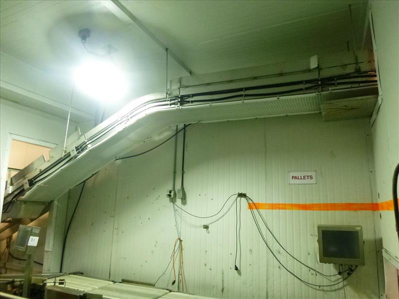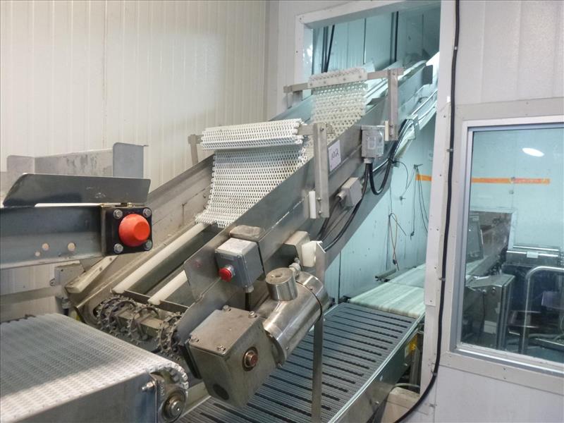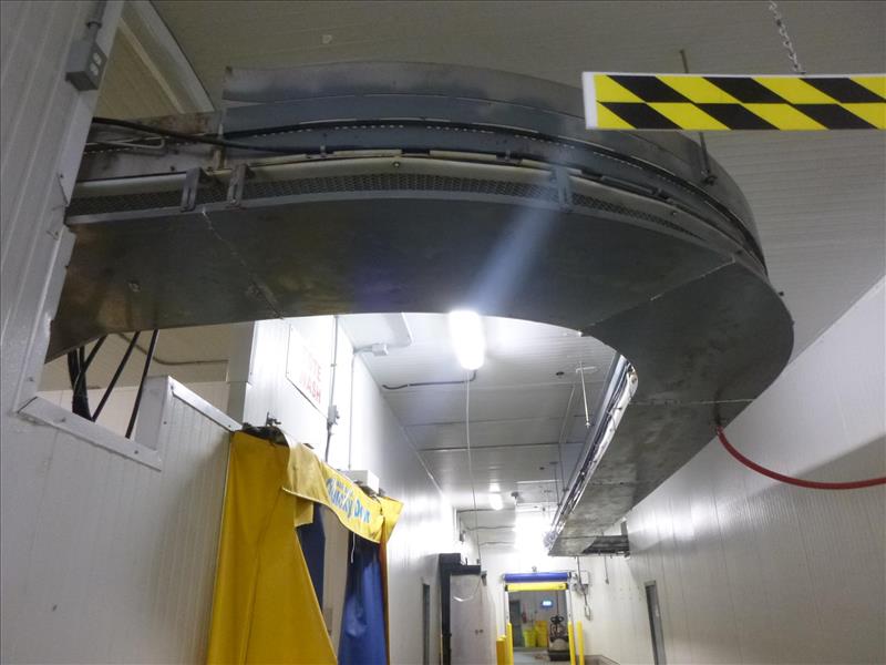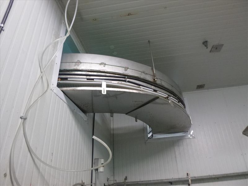 conveyor, suspended, s/s, powered, fluted interlox belt, approximately 20 in. x 16 ft. inclined + 90 deg. + 33 ft. + 180 deg. + 20 ft. inclined (clean tray conveyor)
