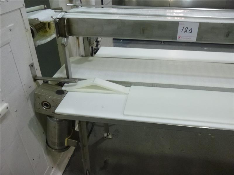 inspection bench w/ conveyor, s/s, powered, interlox belt, approximately 10 in. x 6 ft. inclined, 10 in. x 12 ft. top and 14 in. x 176 in. bottom c/w 1 hp wash-down motor