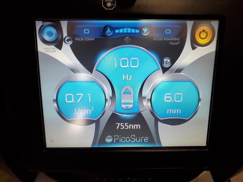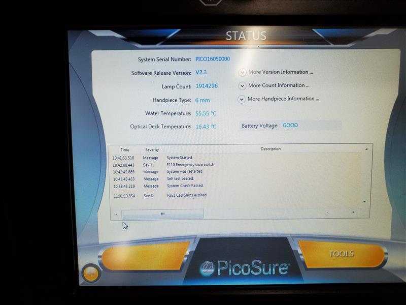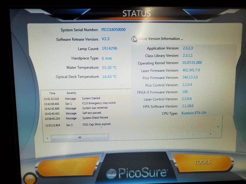 Picosure Picosecond Aesthetic Workstation featuring: Alexandrite laser and zoom handpiece 755nm wavelength Touchscreen operating system 1 Footswitch assembly Laser Warning Sign, Interlock Plug, and Operating Keys