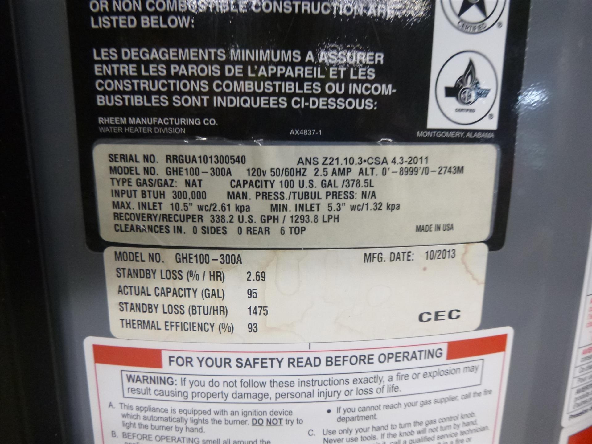 Rheem hot water heater model GHE100-300A, 30000 BTU, 100 gal. cap. (2013)