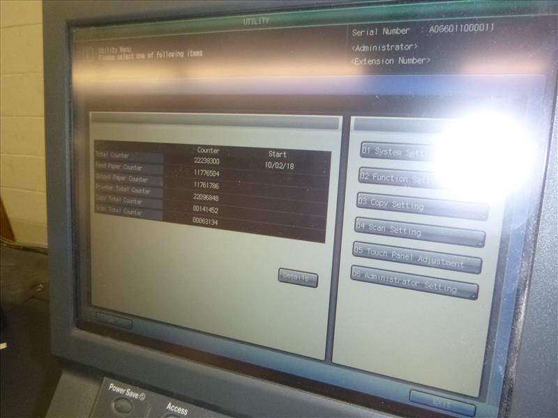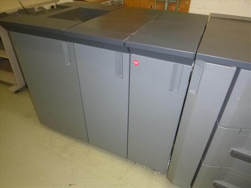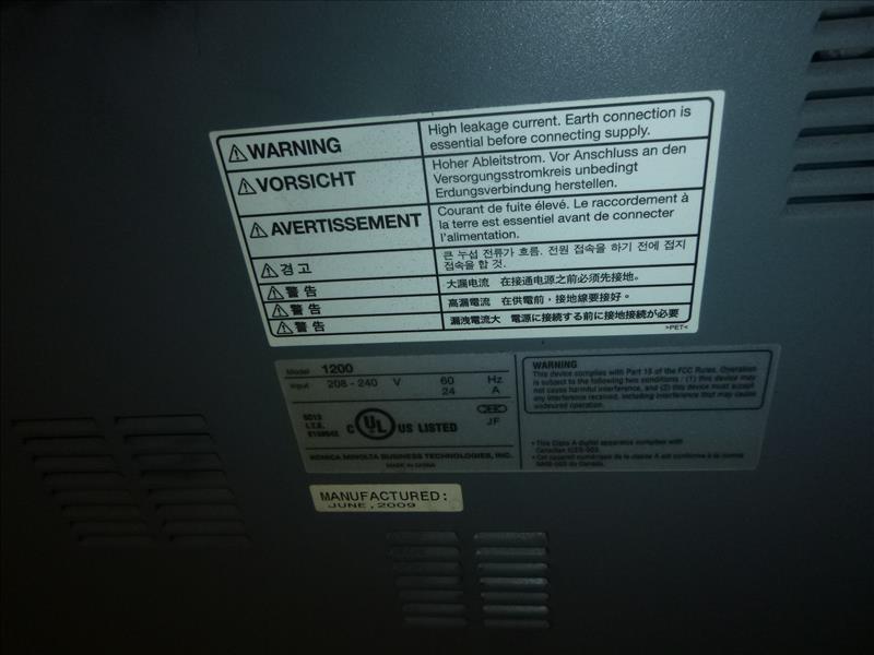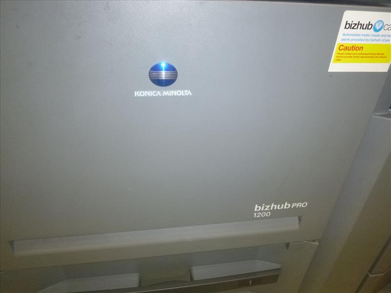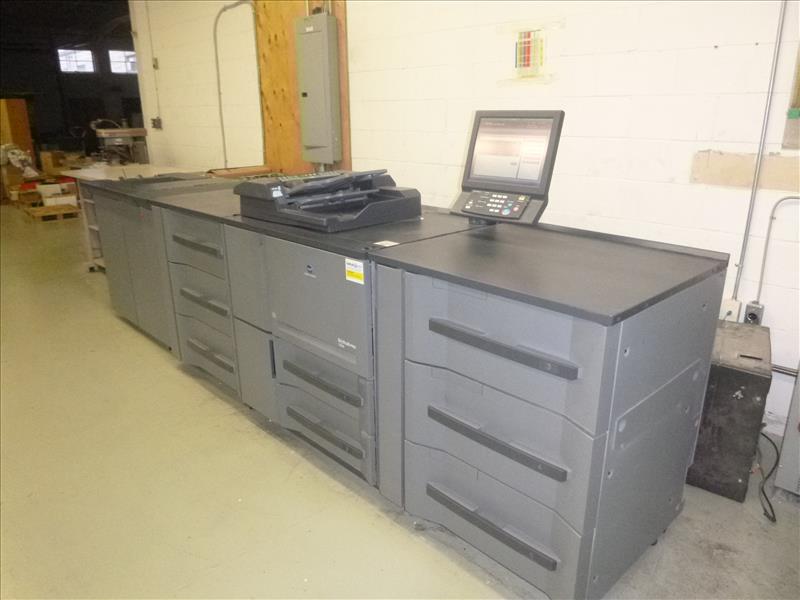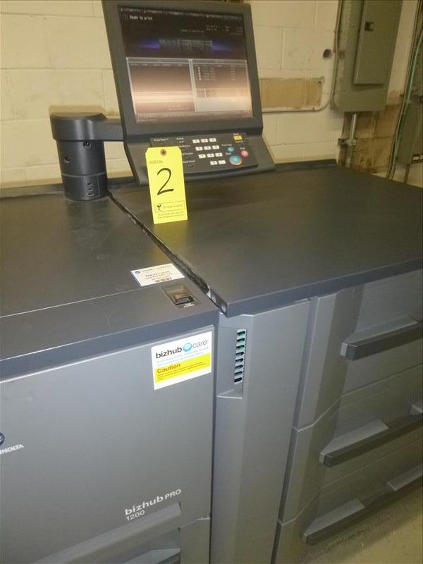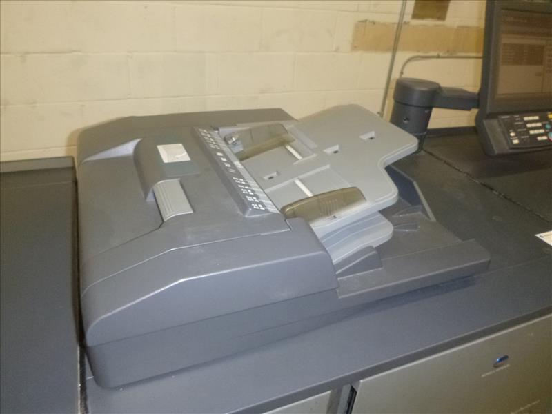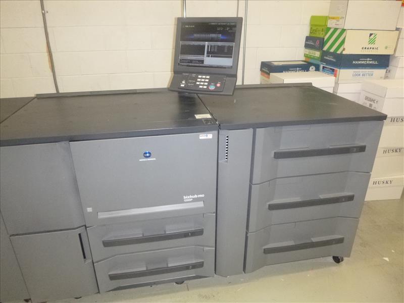 Konica Minolta Bizhub Pro 1200 Monochrome Digital Press 22,238,300 Impressions (2009) 1200 DPI, 12\" x 18\" Print Size, 120 PPM w/GBC Multi Punch Model GP-501 S/N: A0N9W11000253, Model RU 506 Relay Unit, Model FS-521 Finisher, Model DF 615 Document Feeder, Scanner