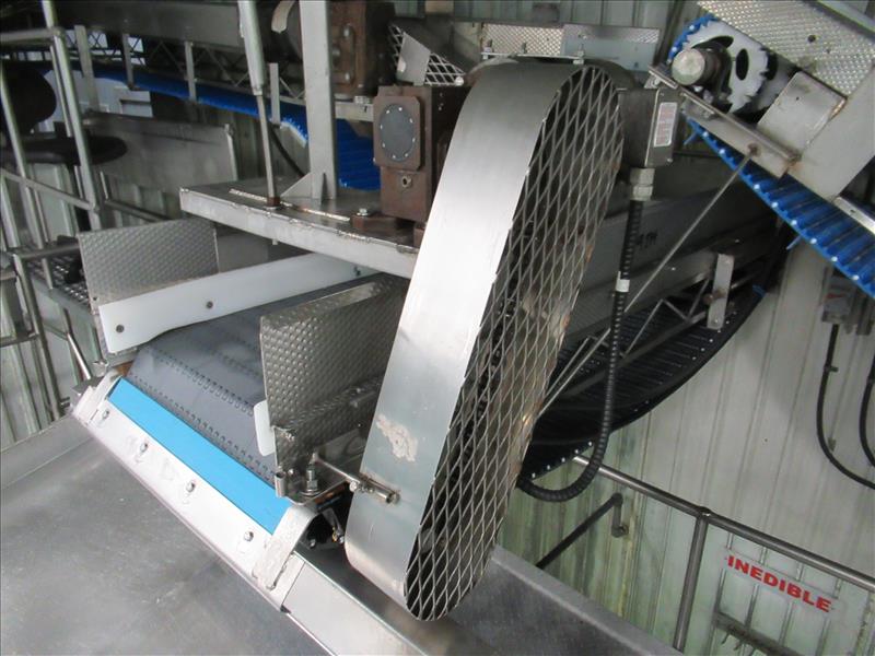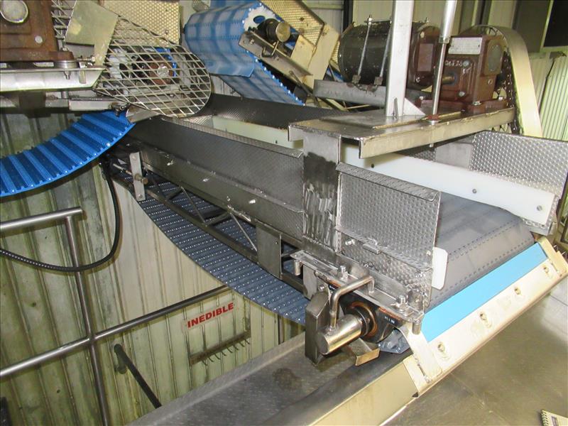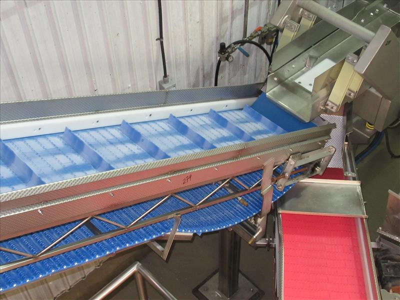 Inclined conveyor, 20 ft. length x 18 in. wide cleated belt, with connecting 4 ft. x 18 in. top mounted shaker feed belt [Bagging Rm]