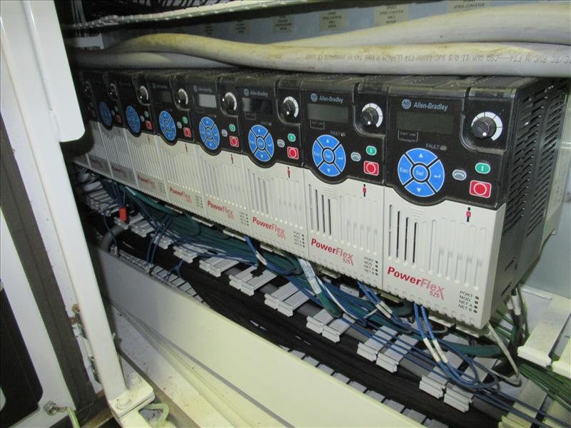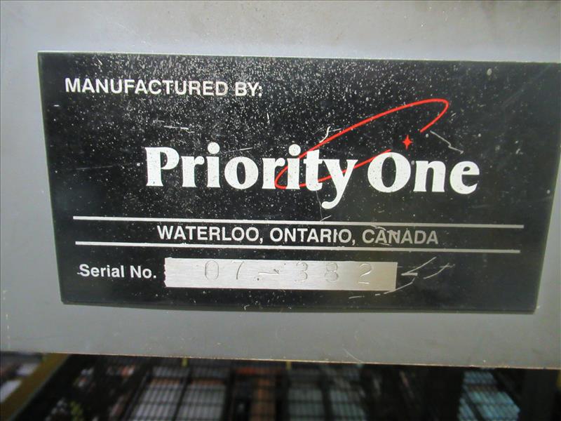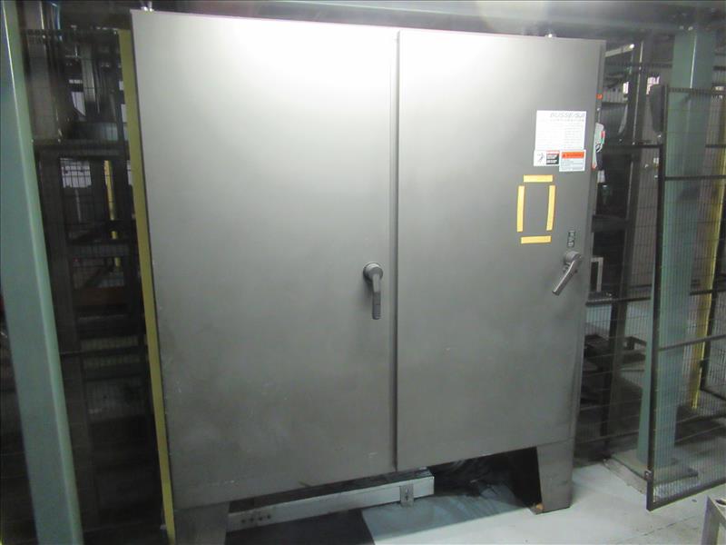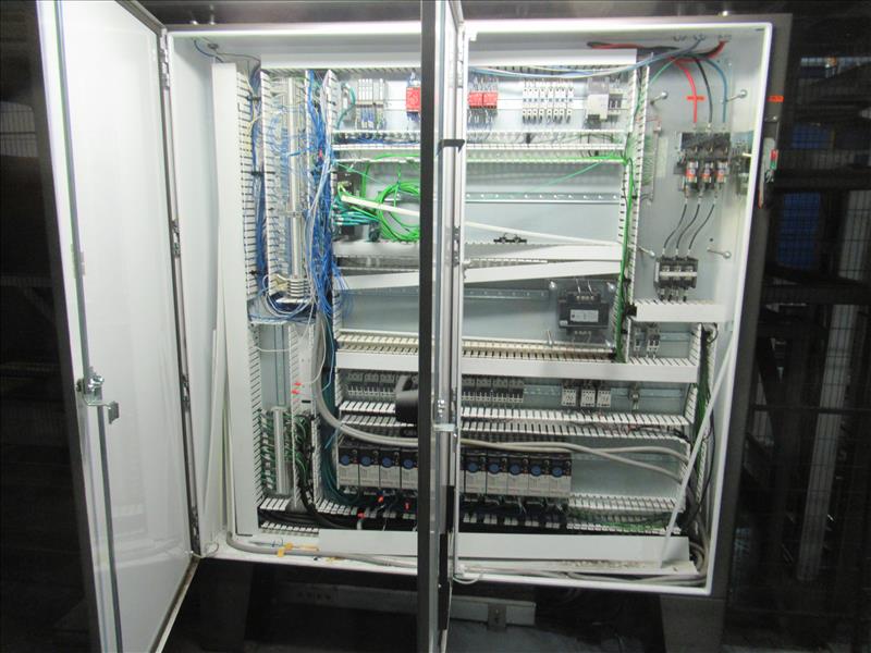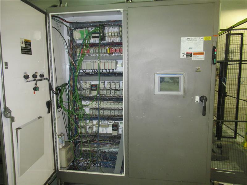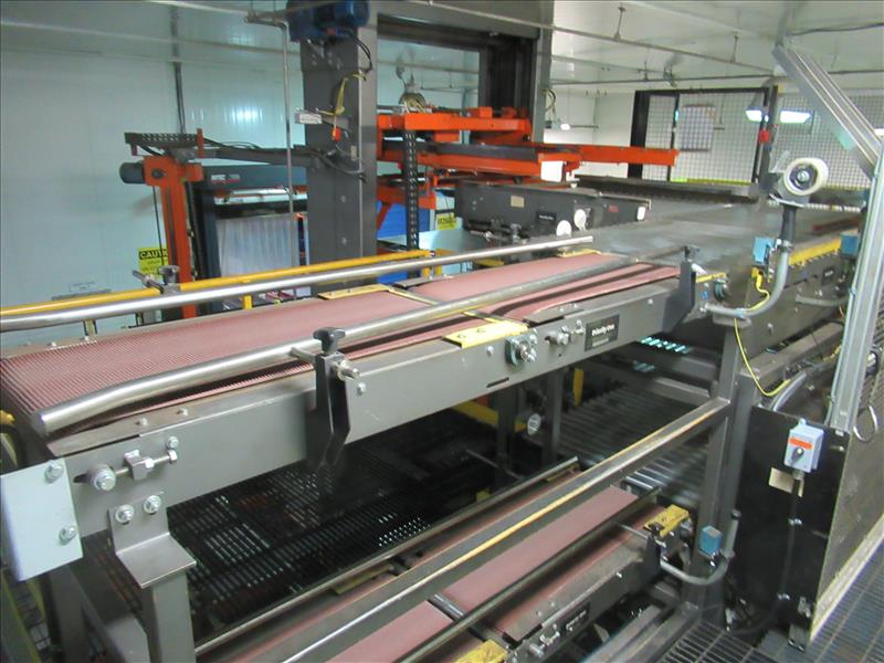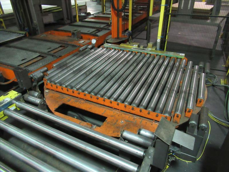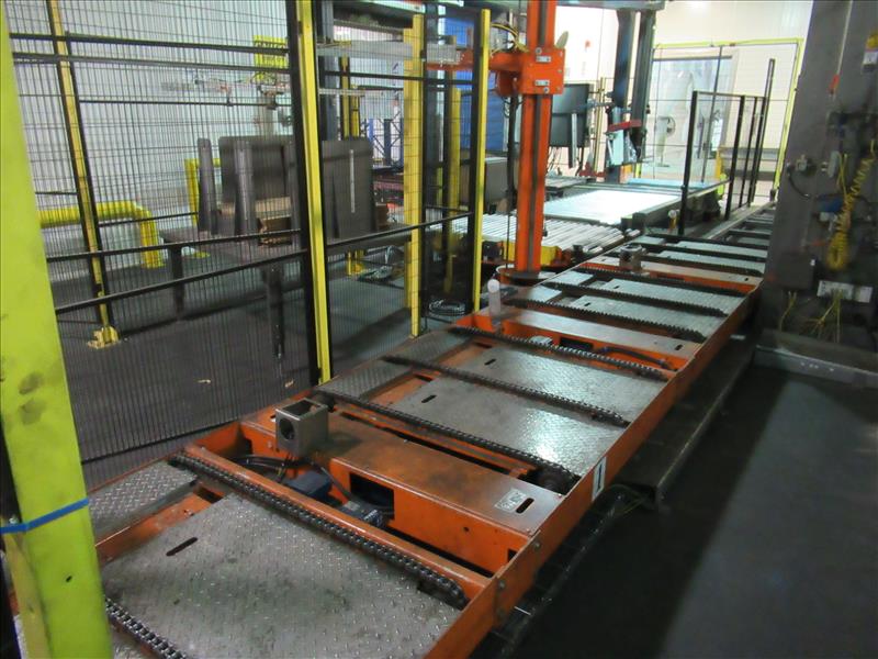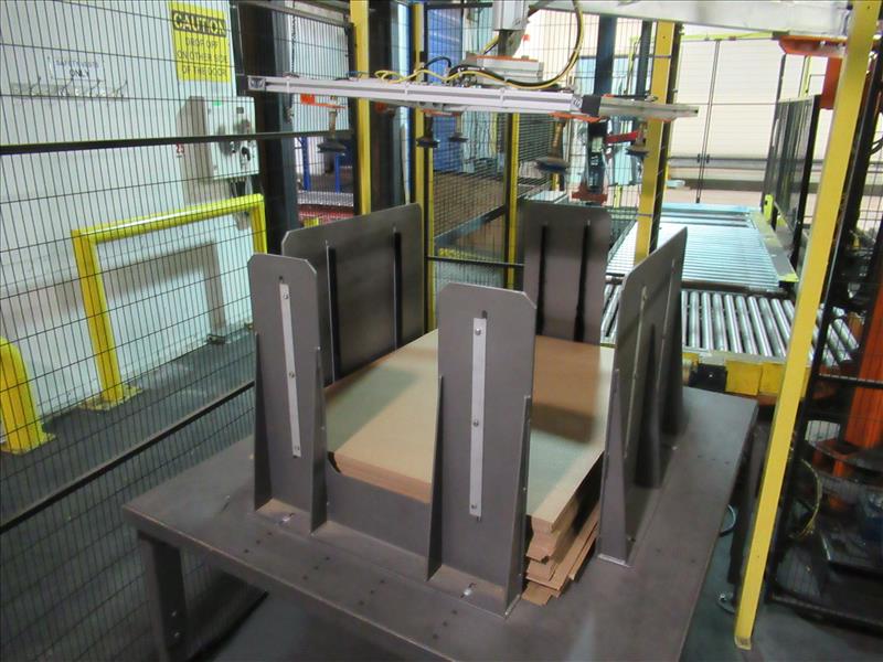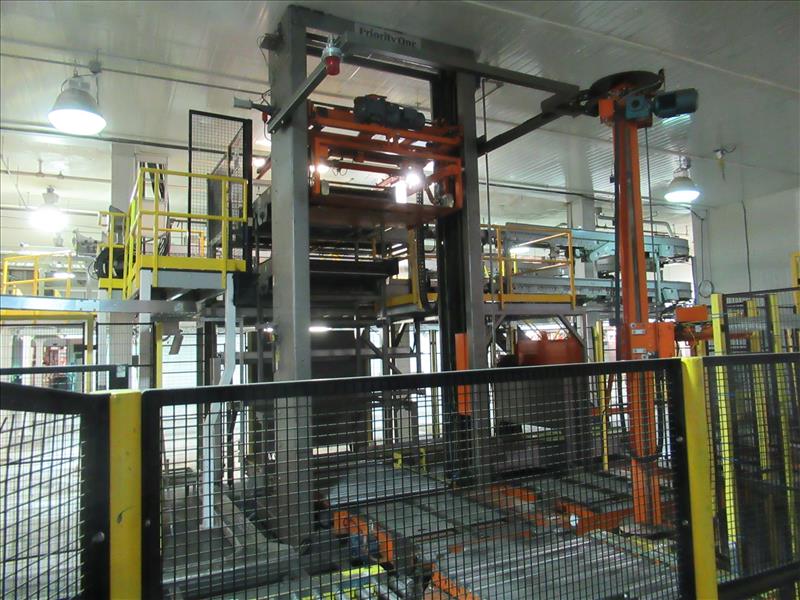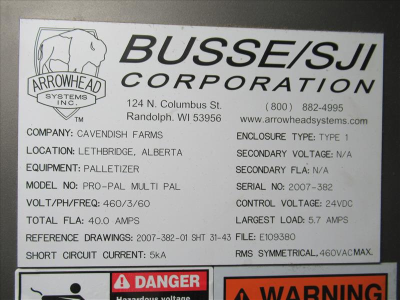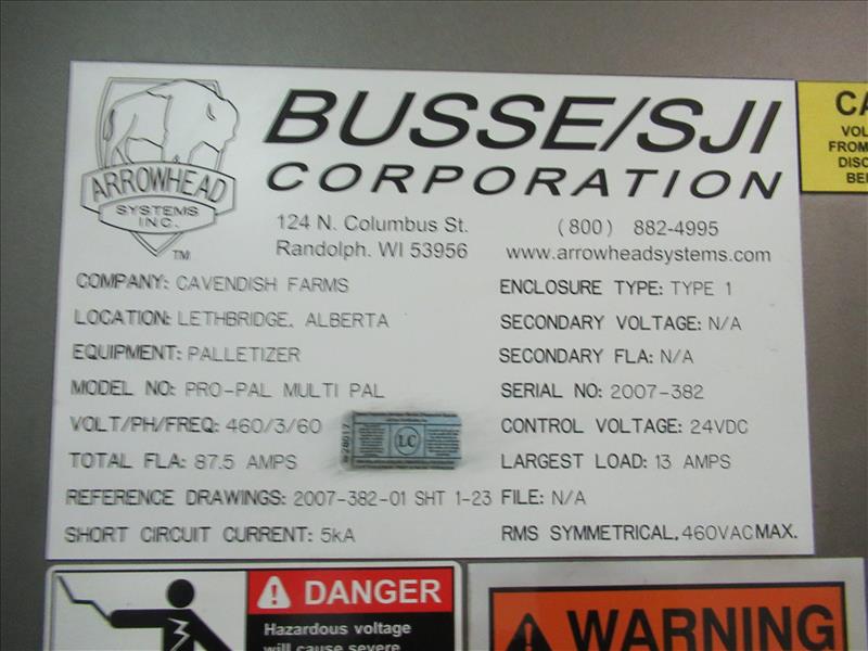 Priority One-Busse Pro-Pal Multi Pal case palletizer, includes (2) Busse Busse/SJI enclosure type PLC control panels, cardboard sheet inserter, associated power pallet shuttle conveyor, pallet turntable, safety grate, inspection deck with operator control panel, s/n 2007-382 [Palletizing ]