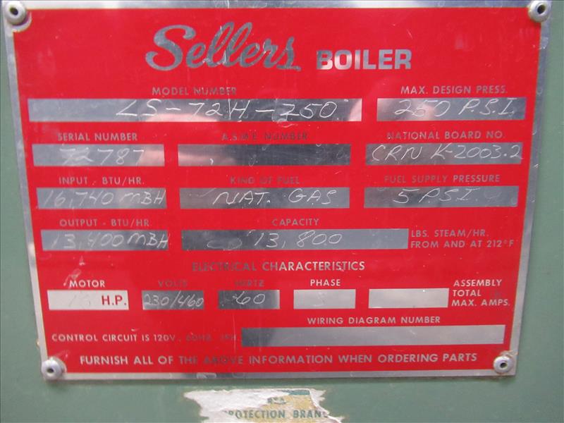 Sellers LS 72H-250 boiler, 250 psi, natural gas burner, BTU input: 16740; output: 13400, s/n 72787 (Boiler #3) [Boiler Room]