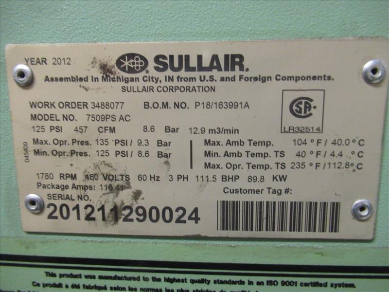 2012 Sullair 7509PS AC air compressor, 125 psi, 457 CFM, 89.8 KW, s/n 201211290024 [Compressor Rm]