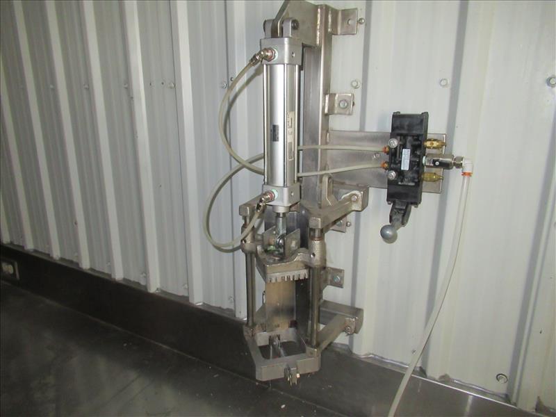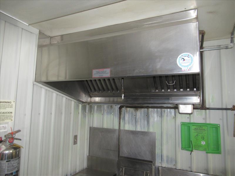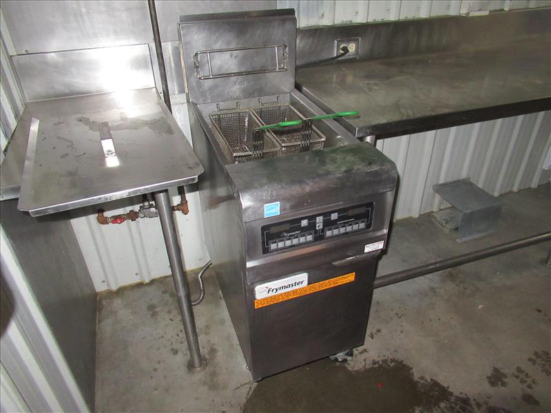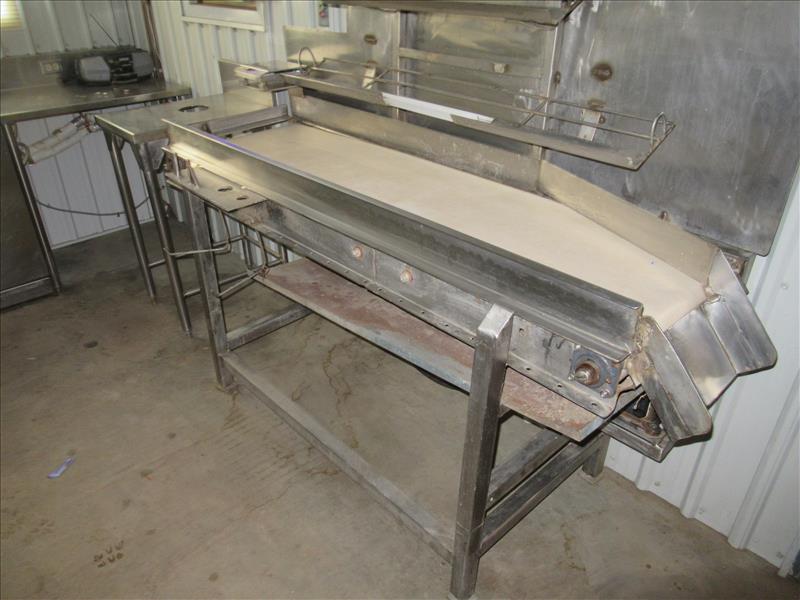Quality control room including Frymaster Fryolater, wall mounted potato slicer, 6 ft. long x 20 in. wide sorting belt, 14 ft. x 6 ft. L-shaped stainless steel counter and stainless steel hood [Receiving]