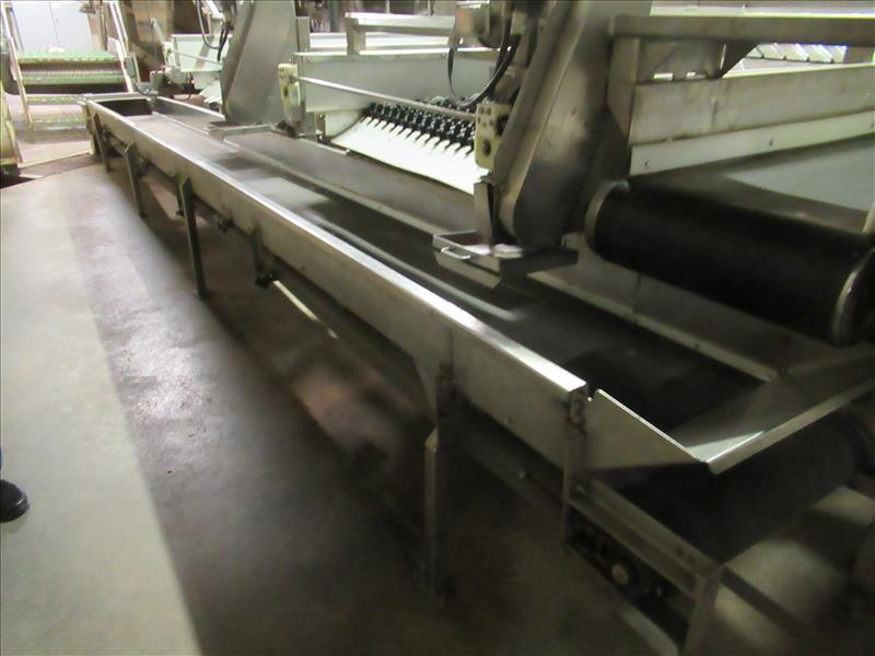 Main belt conveyor, 24 in. wide x 20 ft. long with connecting By Line cross belt conveyor (perpendicular to main transfer belt), with 24 in. wide x 16 ft. rubber belt BI-LINE cross belt conveyor [Receiving]