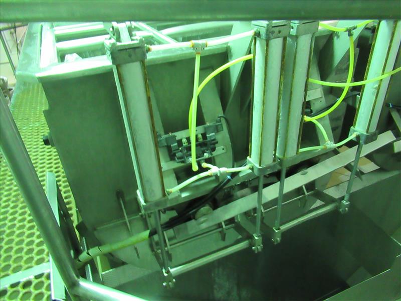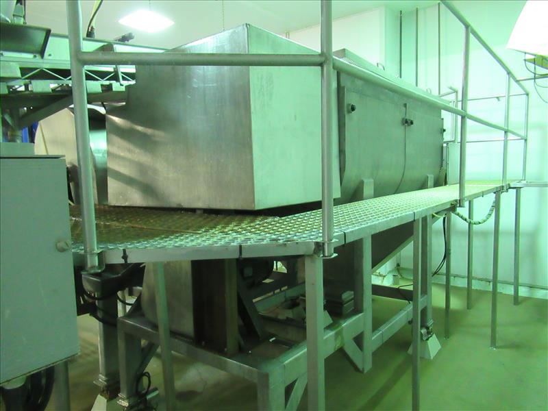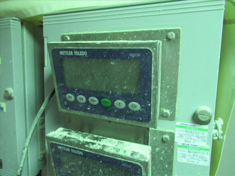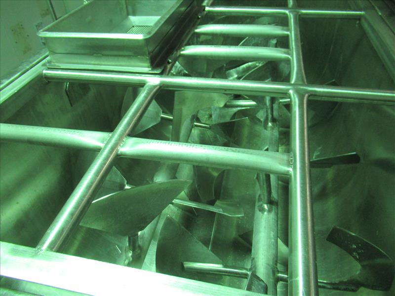 Dbl paddle blender, approx. 84 in. long x 48 in. wide blending chamber, jacketed wall, SEW drive motor, Mettler Toledo weigh cells with readout, pneumatic discharge gates, screen type cover lids, all stianless steel framework [Bi Product ]