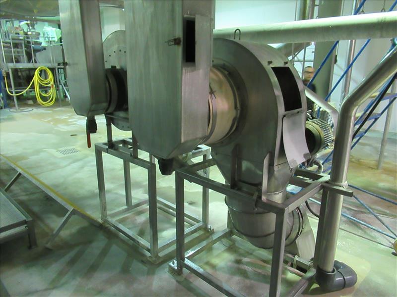 Lot of (2) stainless steel blowers associated with overhead feed belt application, 5 HP motors [Bi Product ]