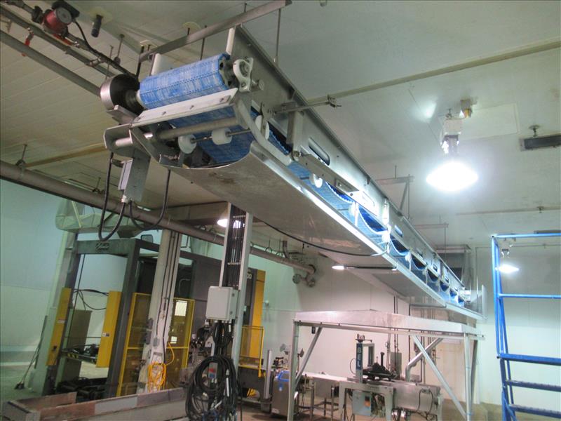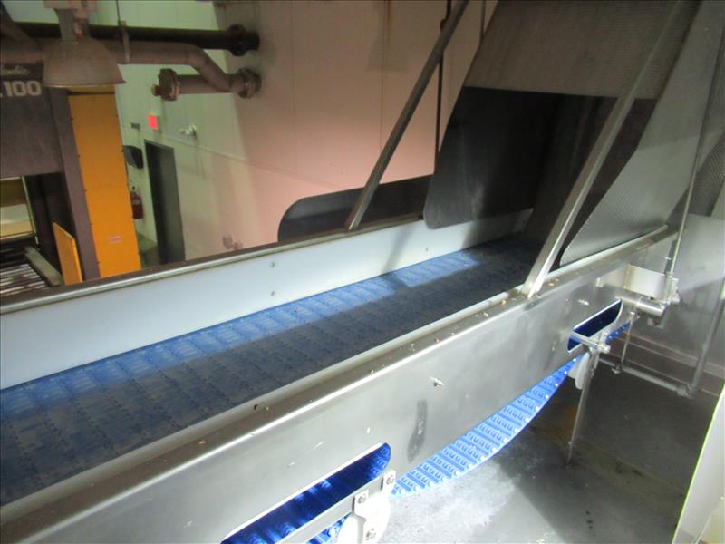 Overhead feed belt, approx 24 ft. long with 24 in. wide plastic belt, stainless steel frame, connecting chute from second floor (feeding Stein Fryer) [Bi Product ]