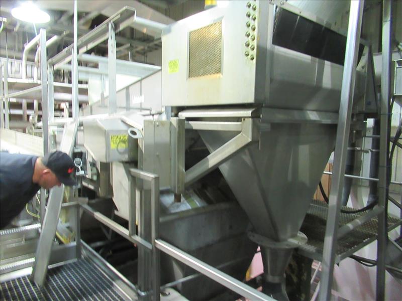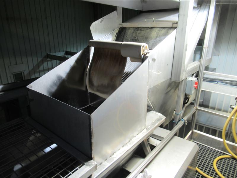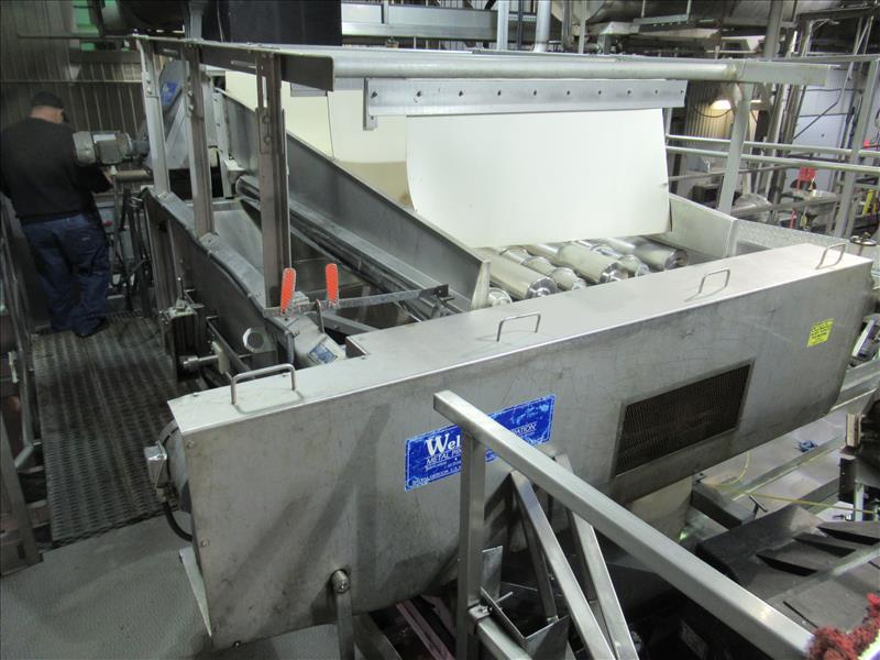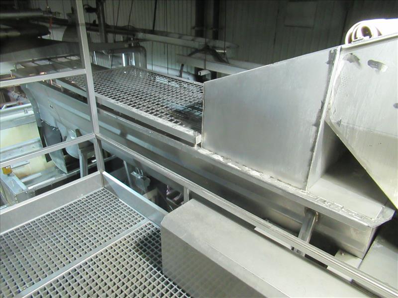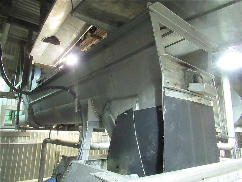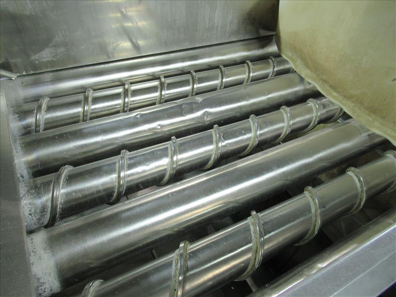 Welliver 19853 roller sizer, consists of (5) 6 in. dia x 7 ft. long size-roller shafts, with connecting 13 ft. long x 18 in. dia feed auger, product waste chute to floor mounted hydro pump [Main Process ]