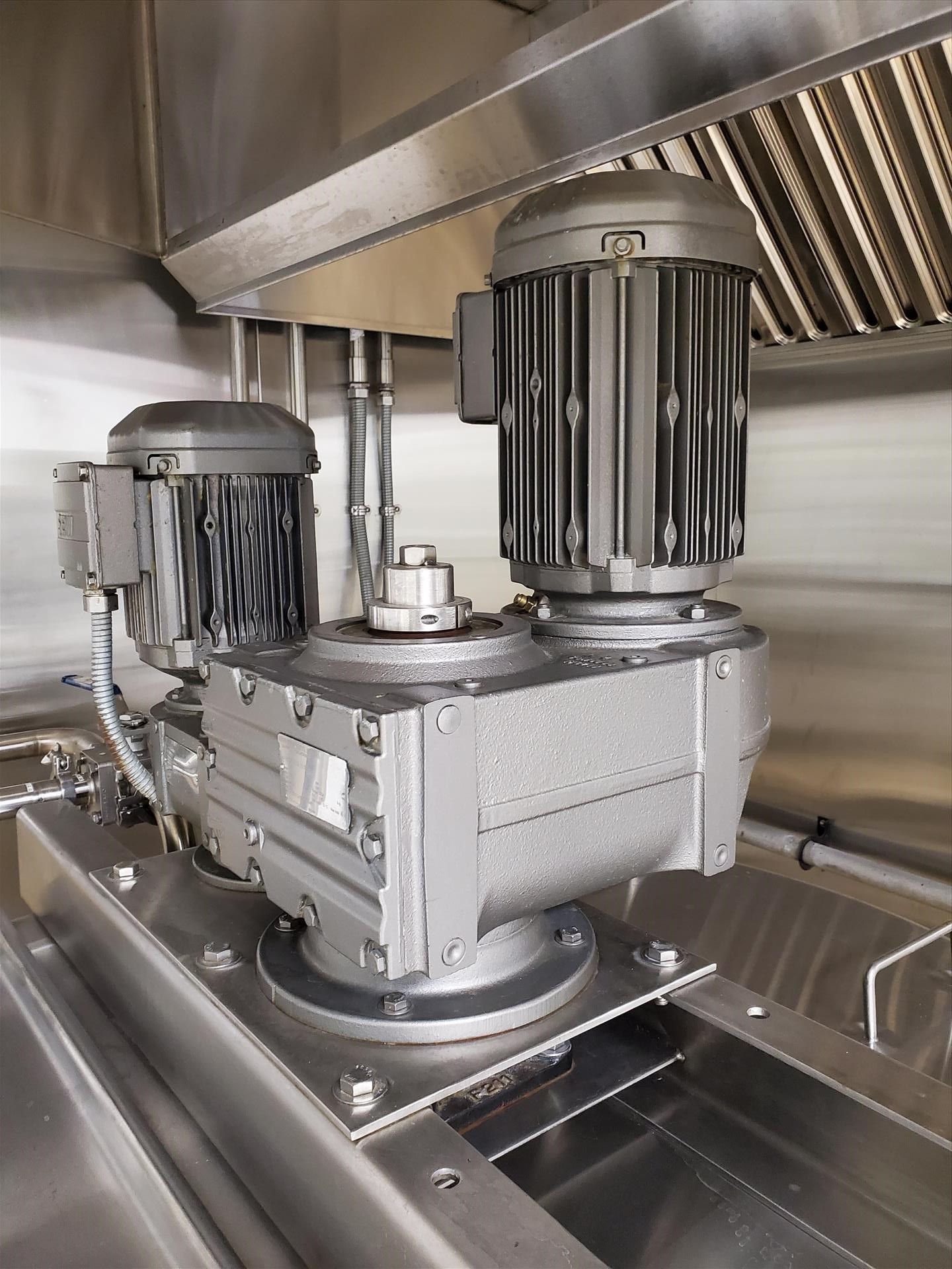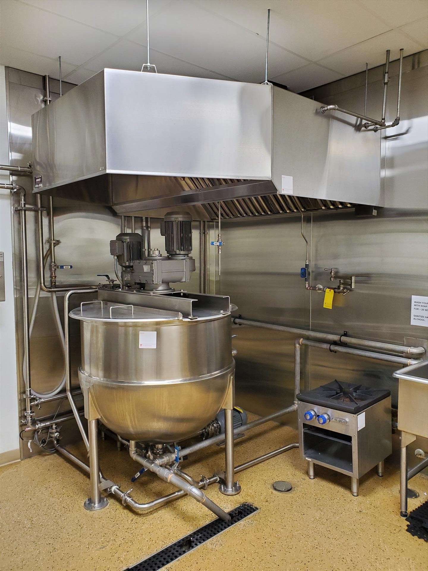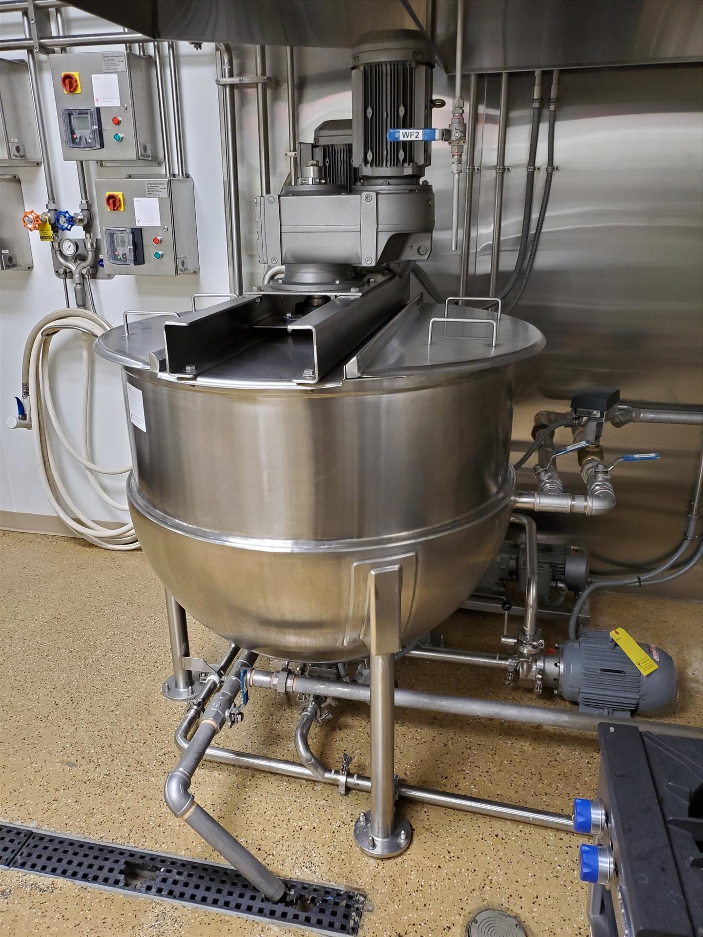 G&F/Befco 150 gallon vertical deluxe finish jacketed hemi mixing kettle, model SST-150, 42 in diam x 15 in s/s x 51 in OAH, shell - 316 SS, open top, jacket 304 s/s w/ (2) 1 1/2 NPT nipples as outlet and inlet, jacket designed for 90 PSIG at 300 deg F w/ G&F Befco vertical mixer (3 hp), model #A-150 w/ removable scraper blades and secondary rotating inverted X-Mas tree mixer (2 hp), w/ digital control units on wall (2015)