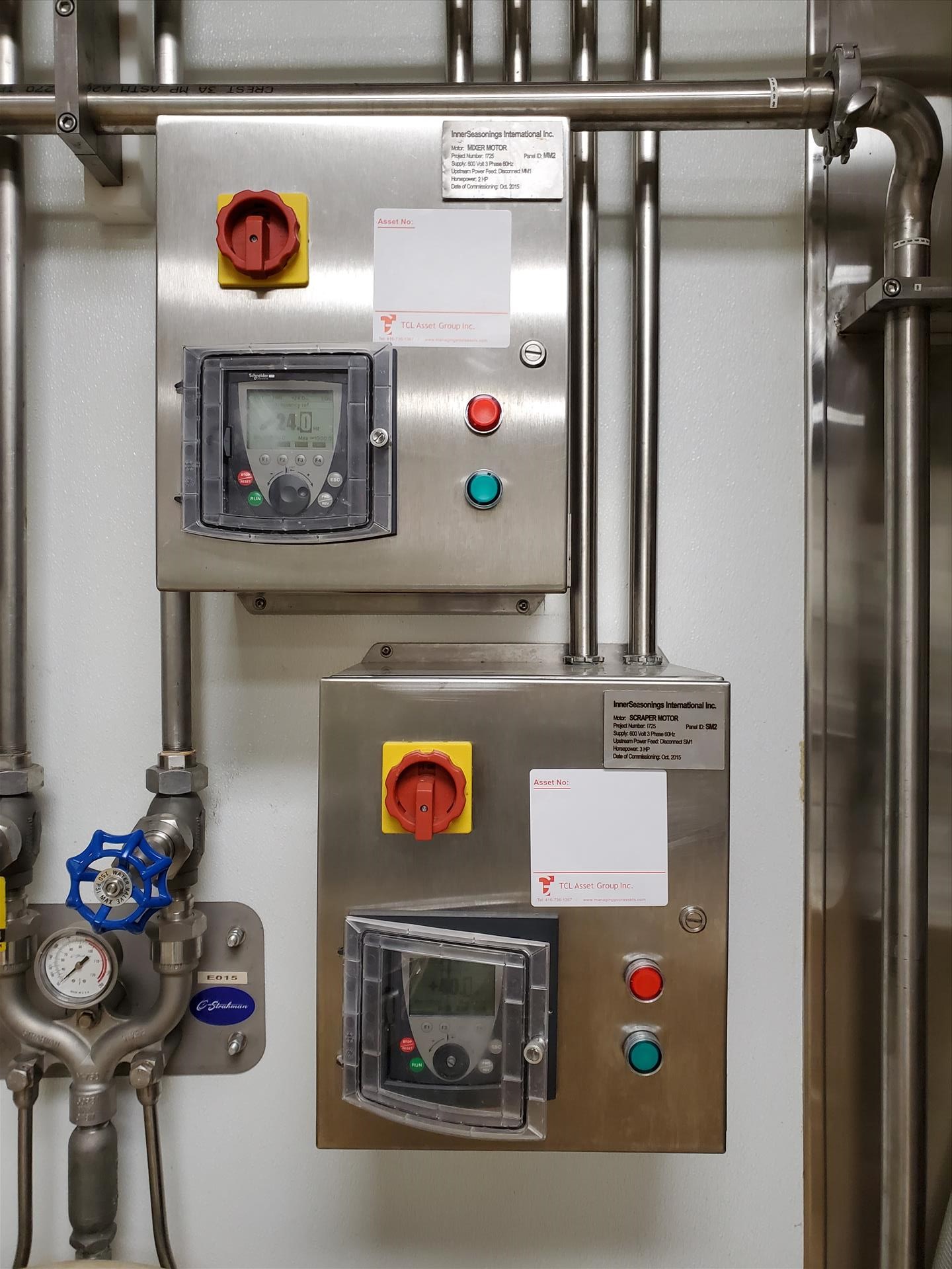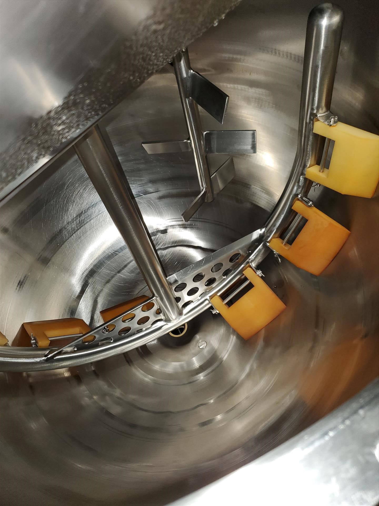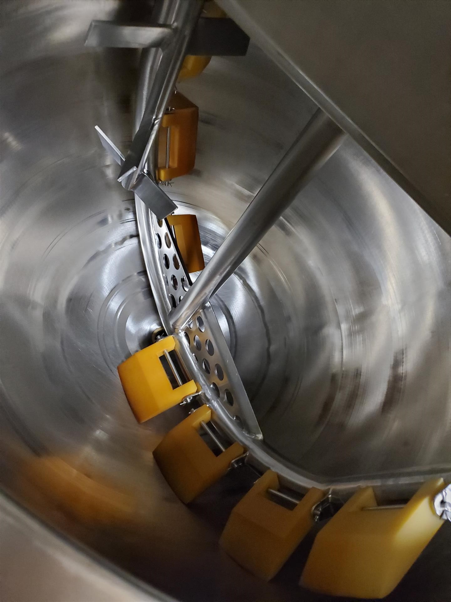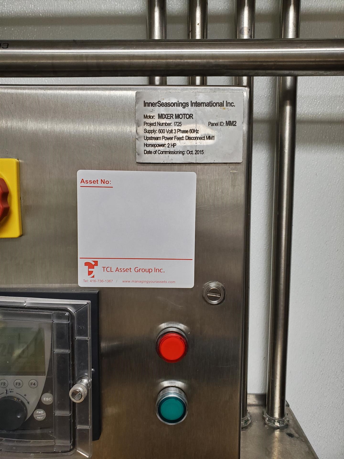 G&F/Befco 150 gallon vertical deluxe finish jacketed hemi mixing kettle, model SST-150, 42 in diam x 15 in s/s x 51 in OAH, shell - 316 SS, open top, jacket 304 s/s w/ (2) 1 1/2 NPT nipples as outlet and inlet, jacket designed for 90 PSIG at 300 deg F w/ G&F Befco vertical mixer (3 hp), model #A-150 w/ removable scraper blades and secondary rotating inverted X-Mas tree mixer (2 hp), w/ digital control units on wall (2015)