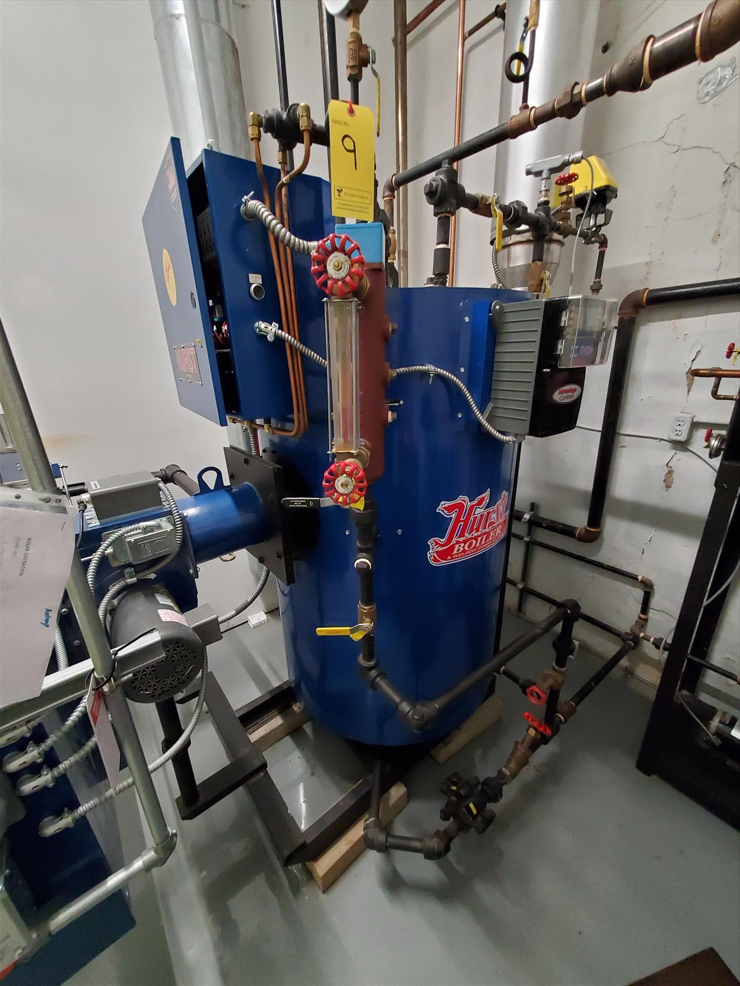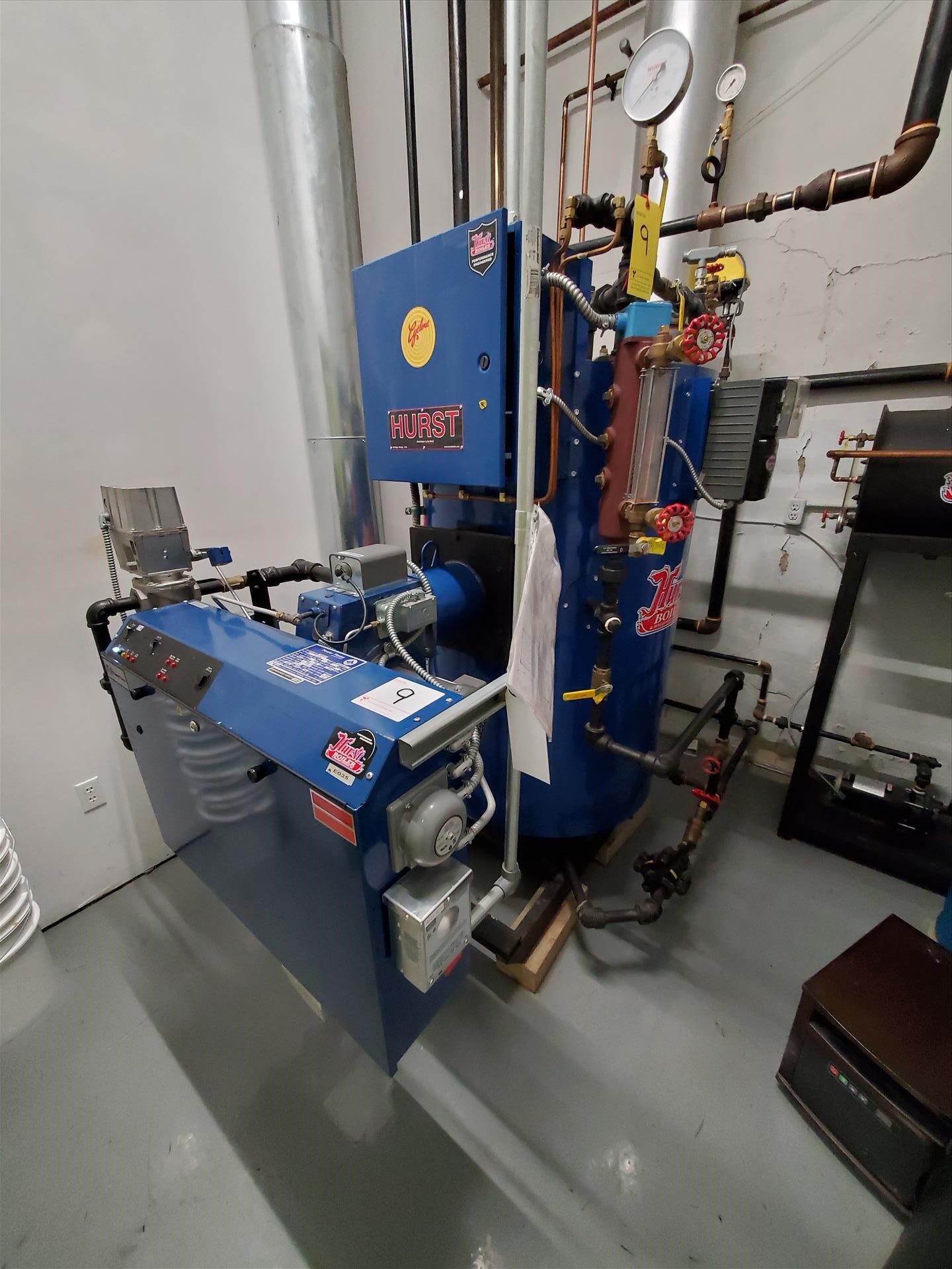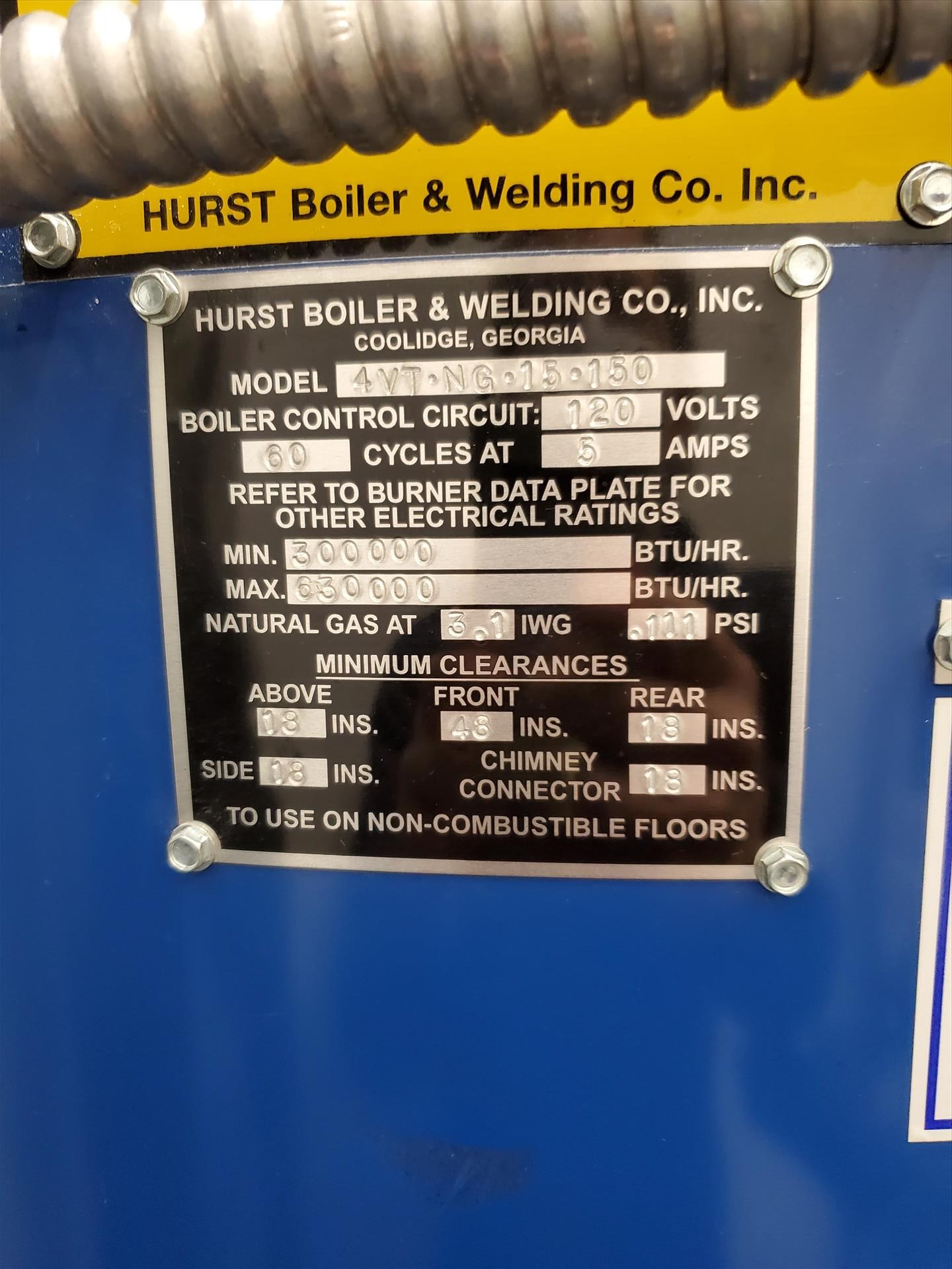 Hurst/Powerflame natural gas boiler, model 4VT-NG-15-150 steam boiler/burner package unit, 518 PPH output, 630,000 BTUH input; s/n V55-150-1092, w/ Duplex feed water system (2015)