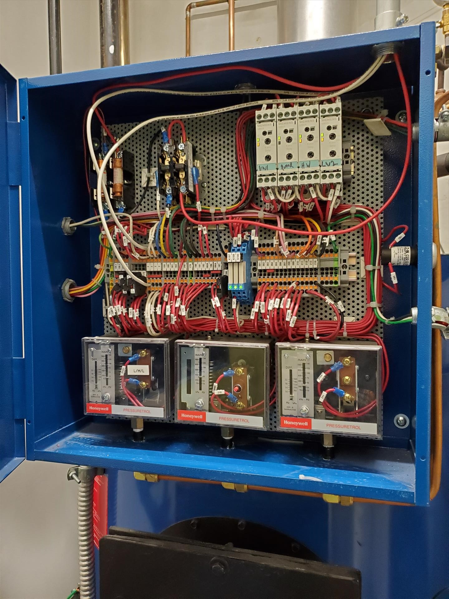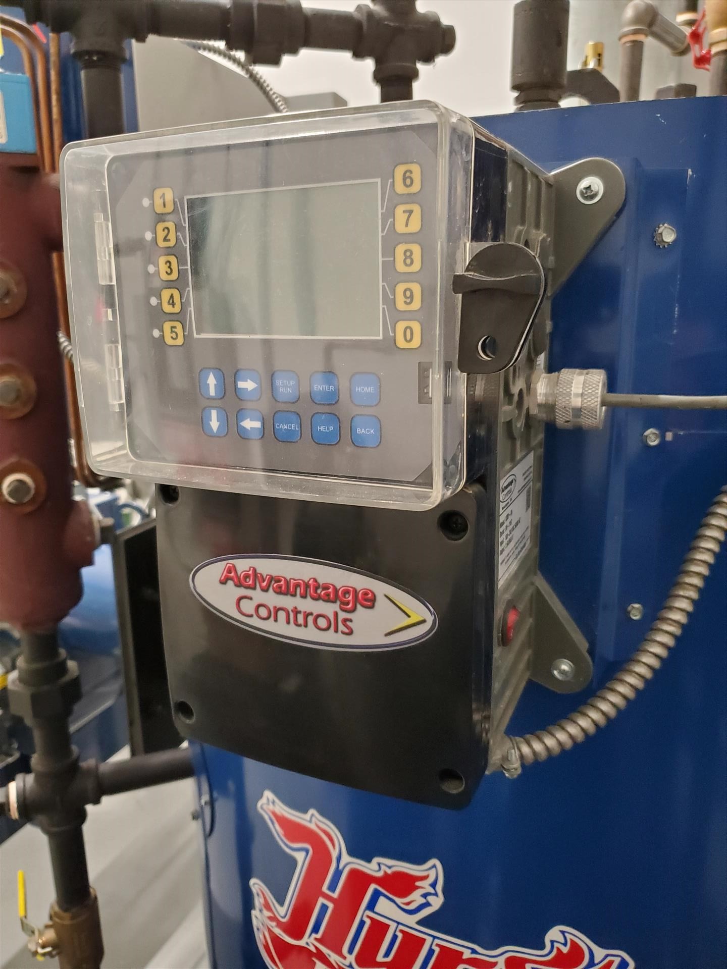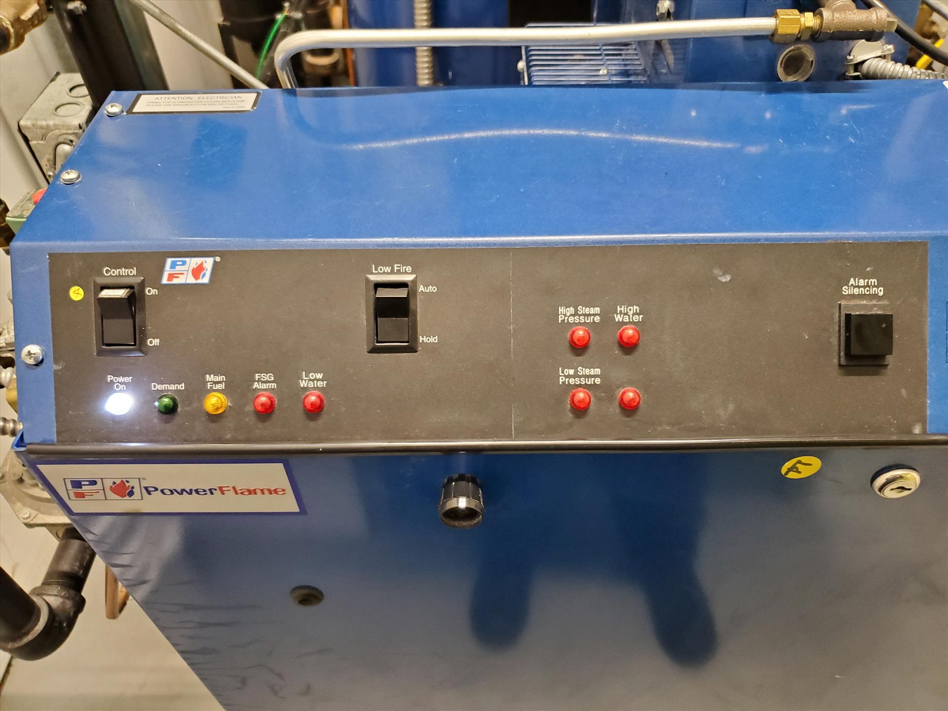 Hurst/Powerflame natural gas boiler, model 4VT-NG-15-150 steam boiler/burner package unit, 518 PPH output, 630,000 BTUH input; s/n V55-150-1092, w/ Duplex feed water system (2015)
