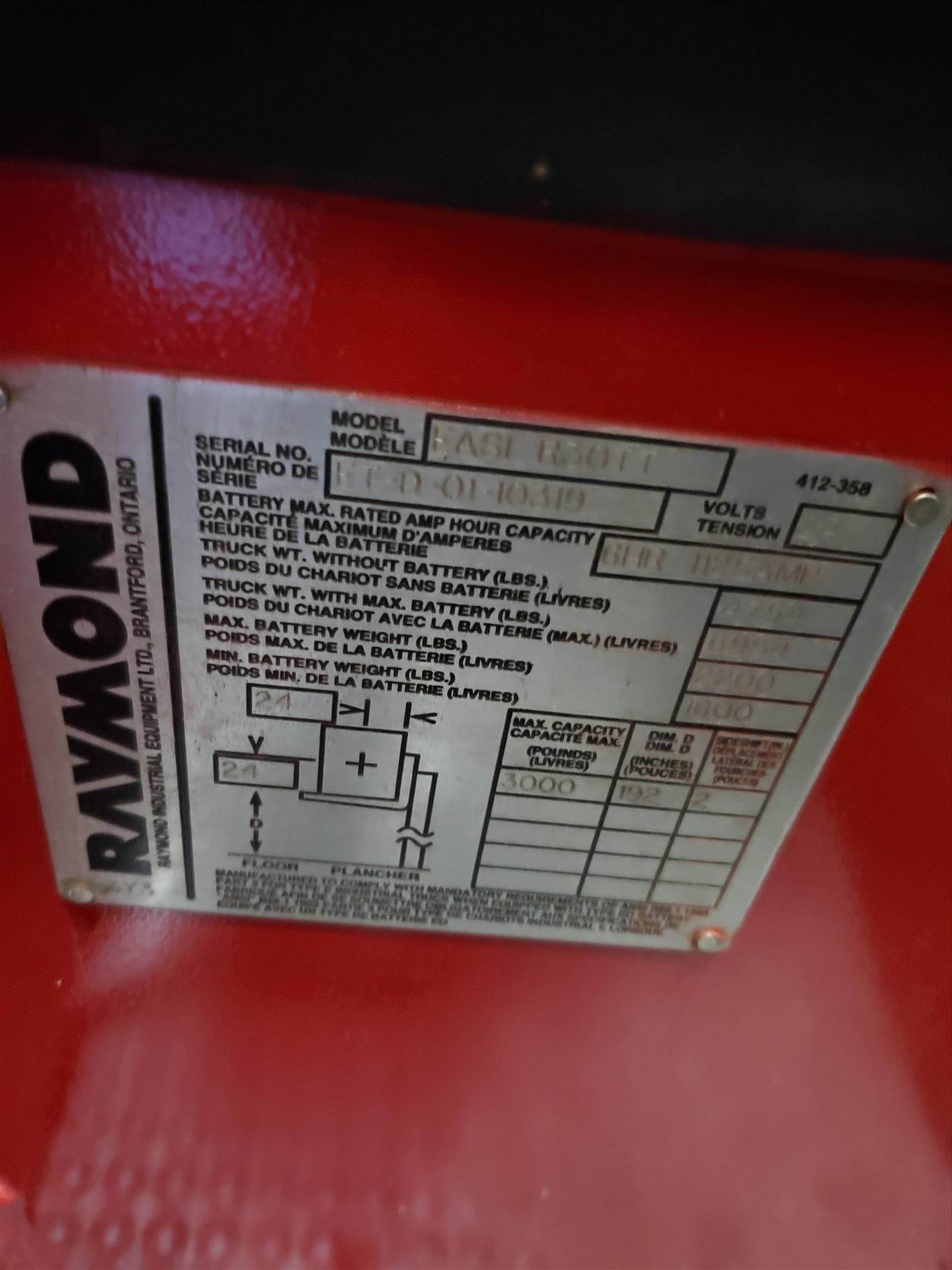 Raymond reach truck, model EASI R30TT, 3000 lb. capacity, ser. no. ET-D-01-10319, 24V c/w SCR 200 charger